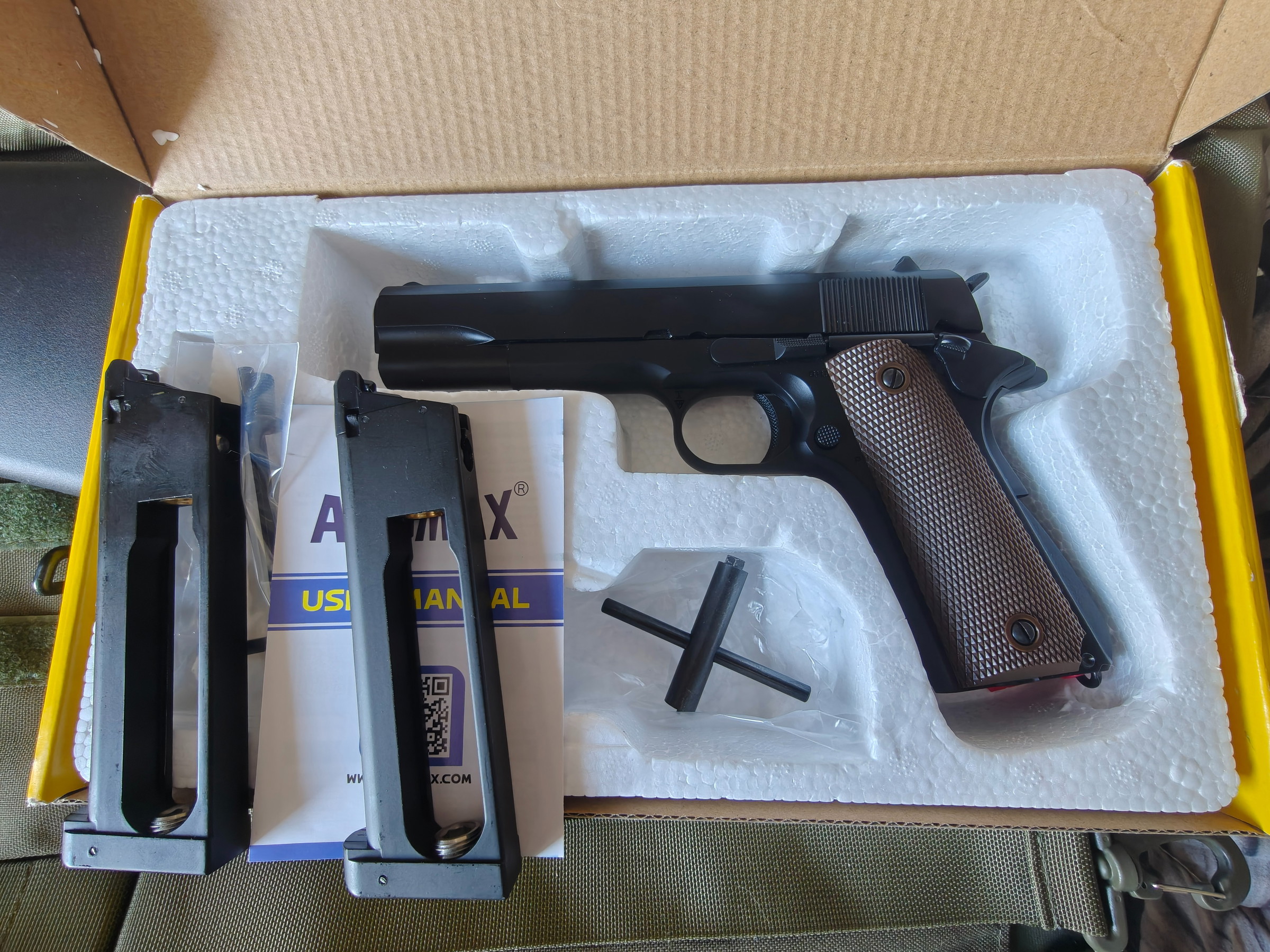 Orginele doos met alle onderdelen en 2 magazijnen plus extra pistool houder