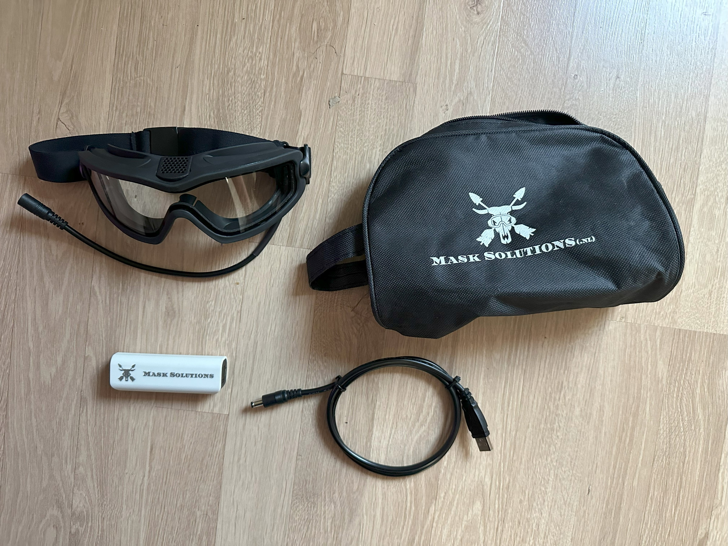 Lunette avec ventilateur intégré permettant de lutter contre la buée, alimentée par powerbank.