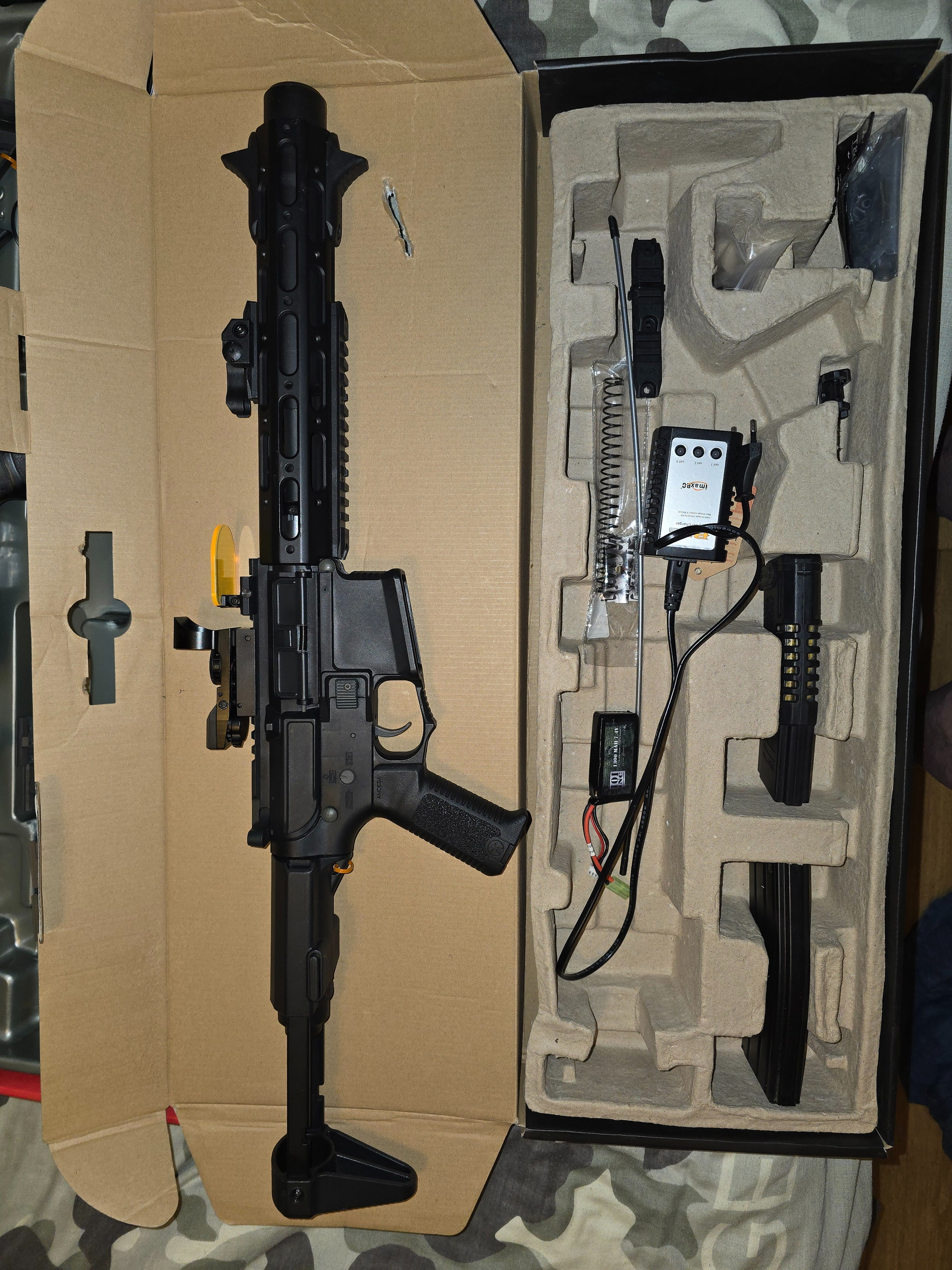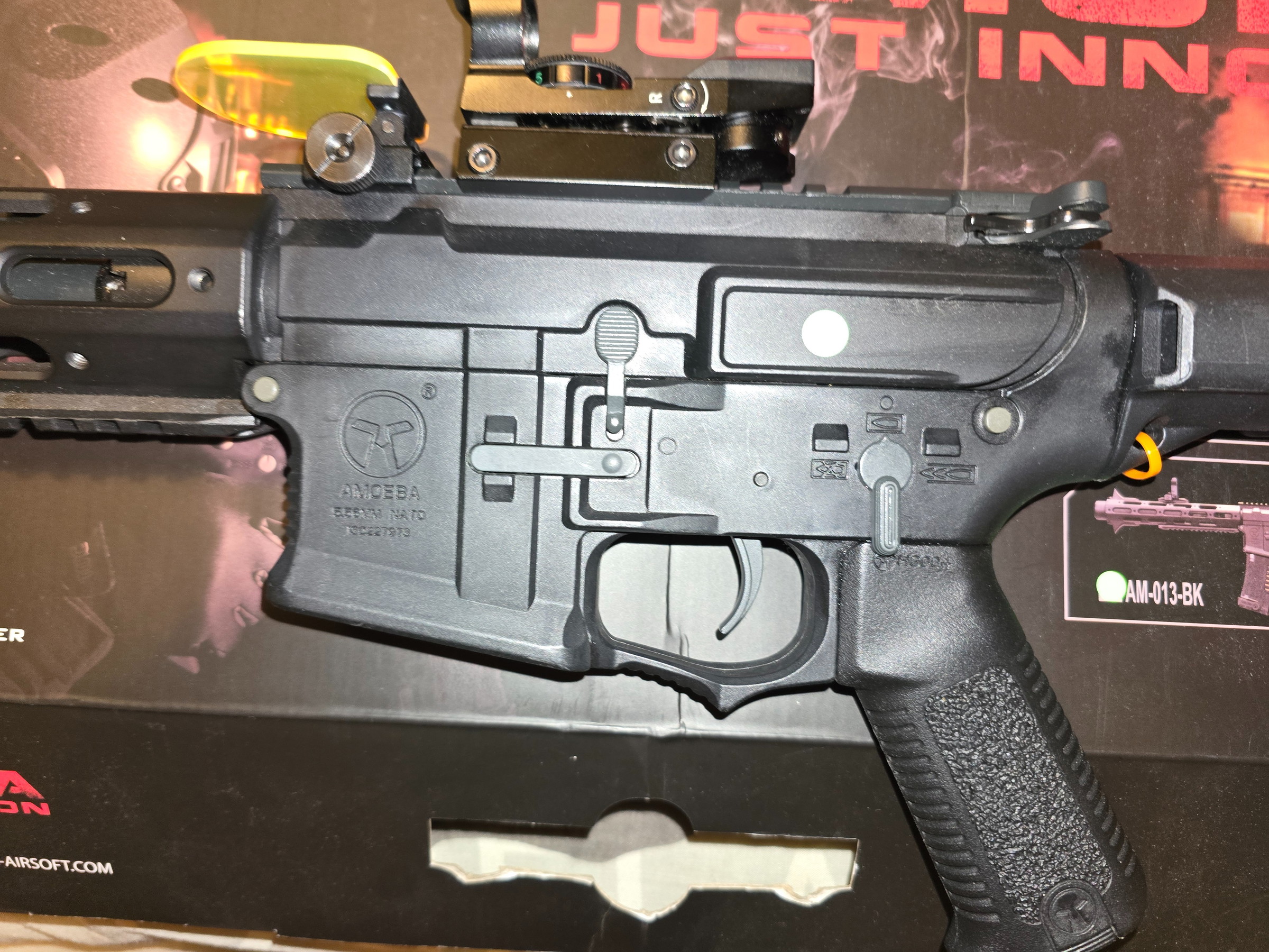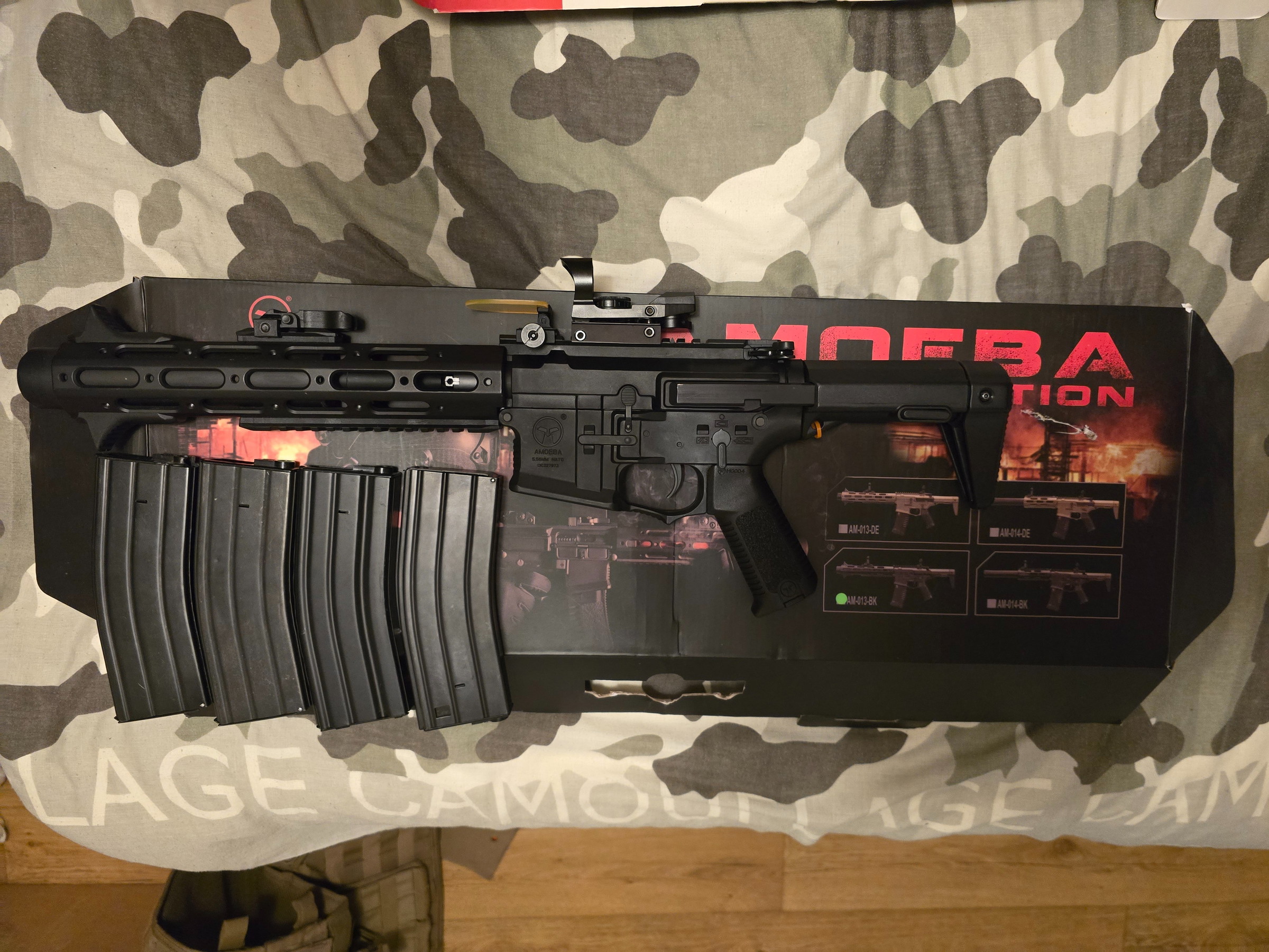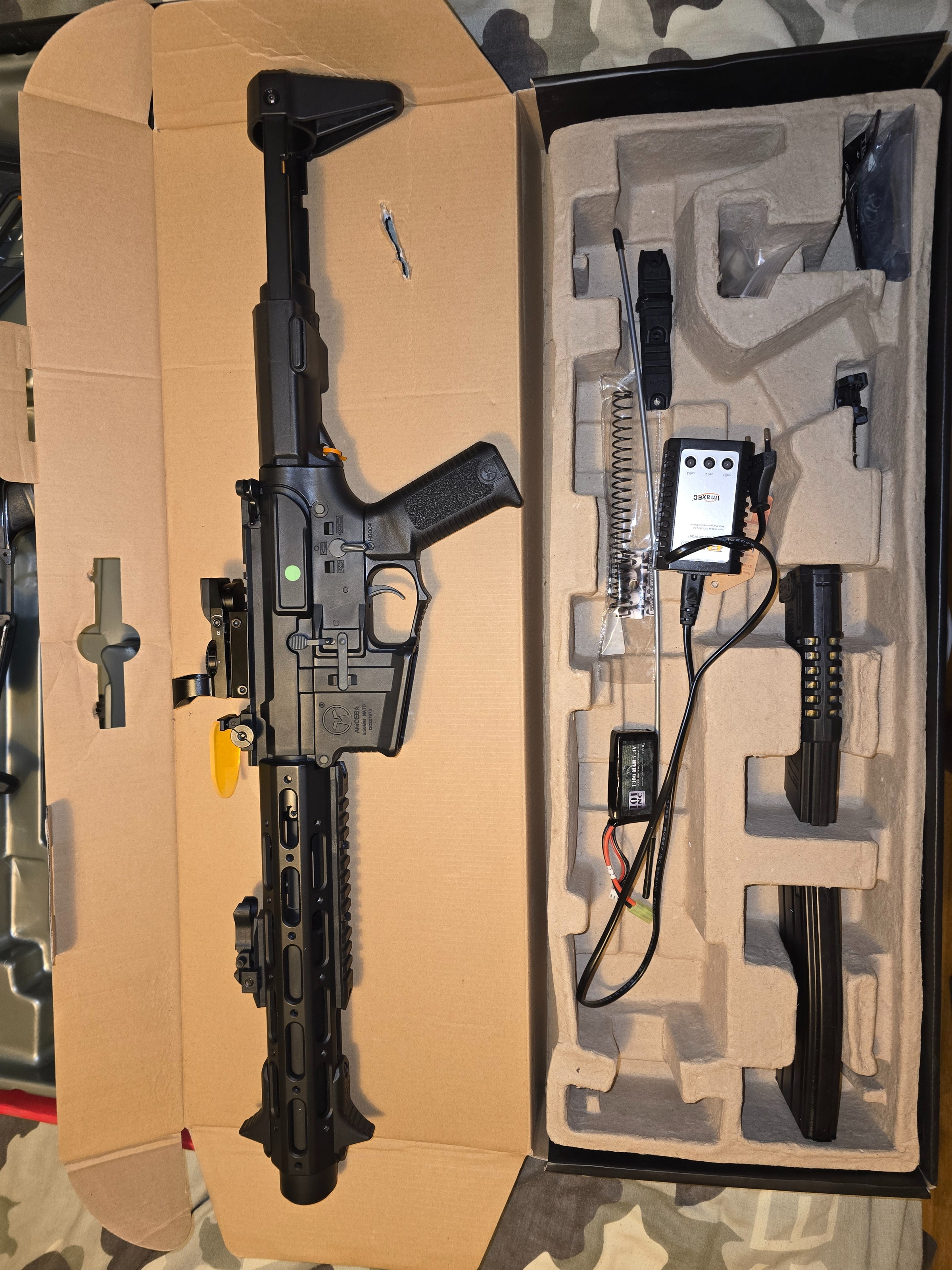 Model AM-013-BK of wel honey badger genoemd in heel goed staat bij geleverd 4 magazijn maar moet wel nieuw lipo baterijen bij want deze werken niet meer zijn te oud het geweer is in perfecte staat