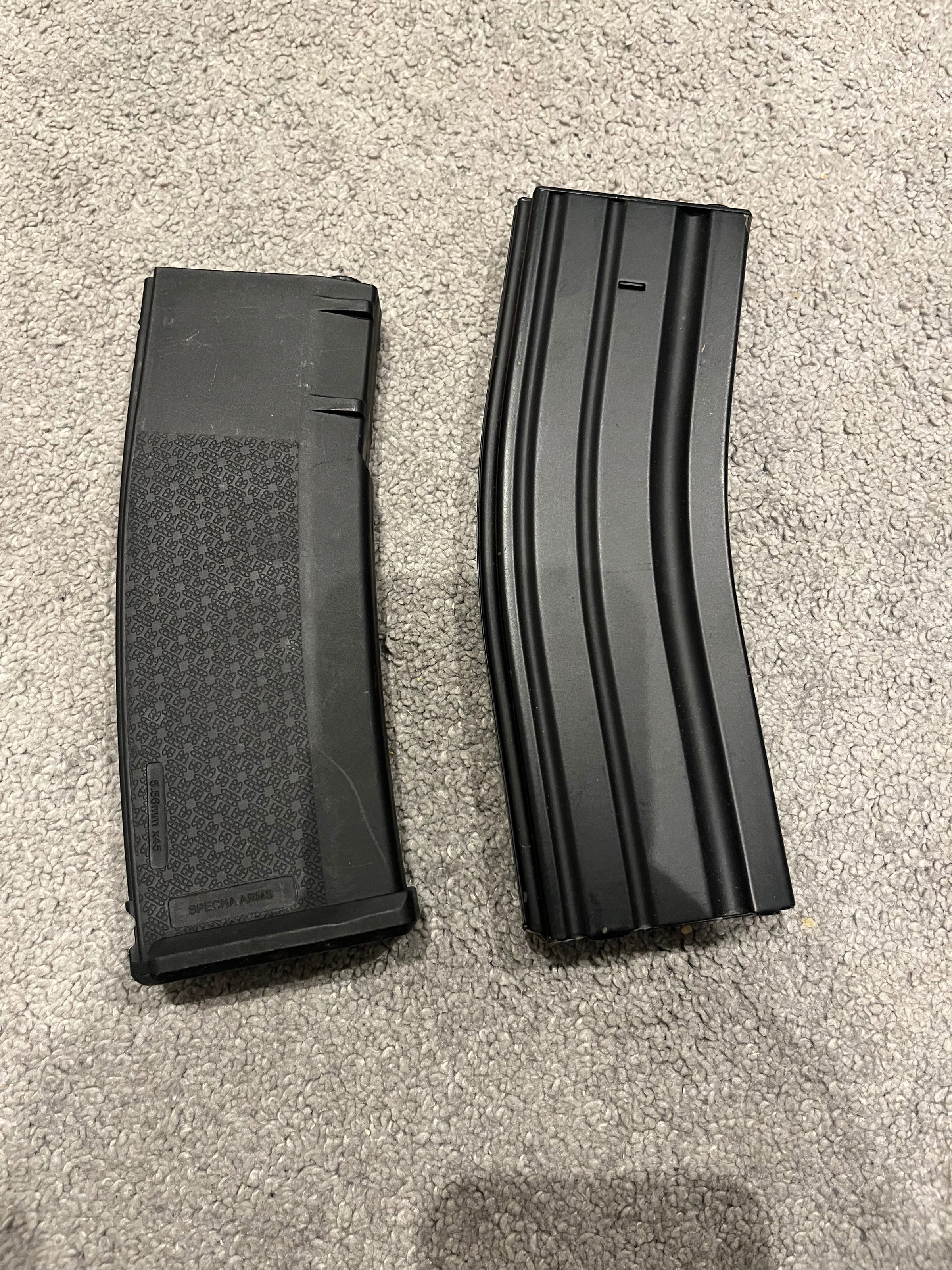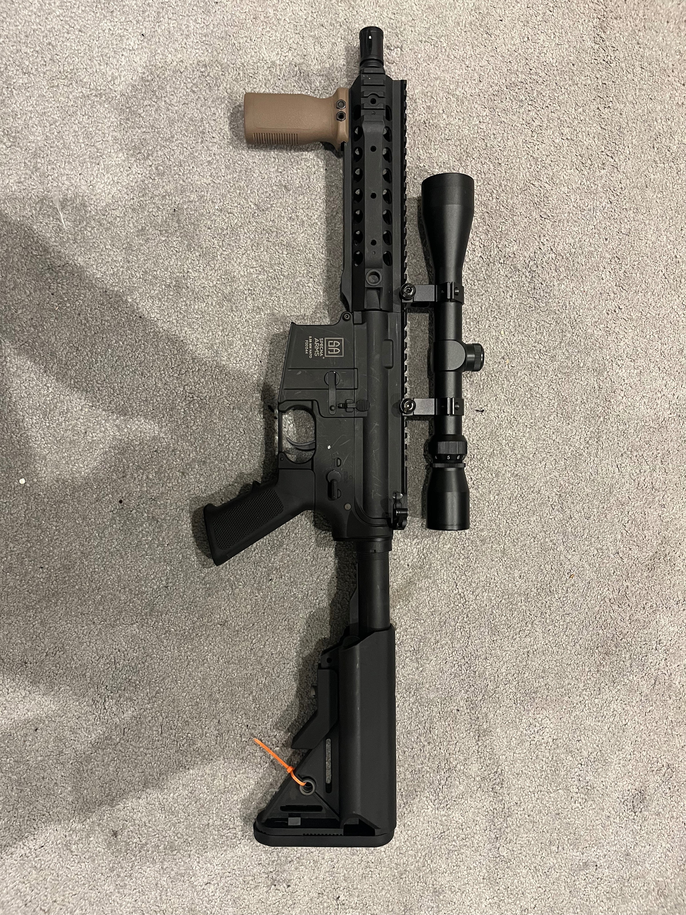 Full black polymer carbine replica. barely used with a few scratches, a small piece of the stock is missing.