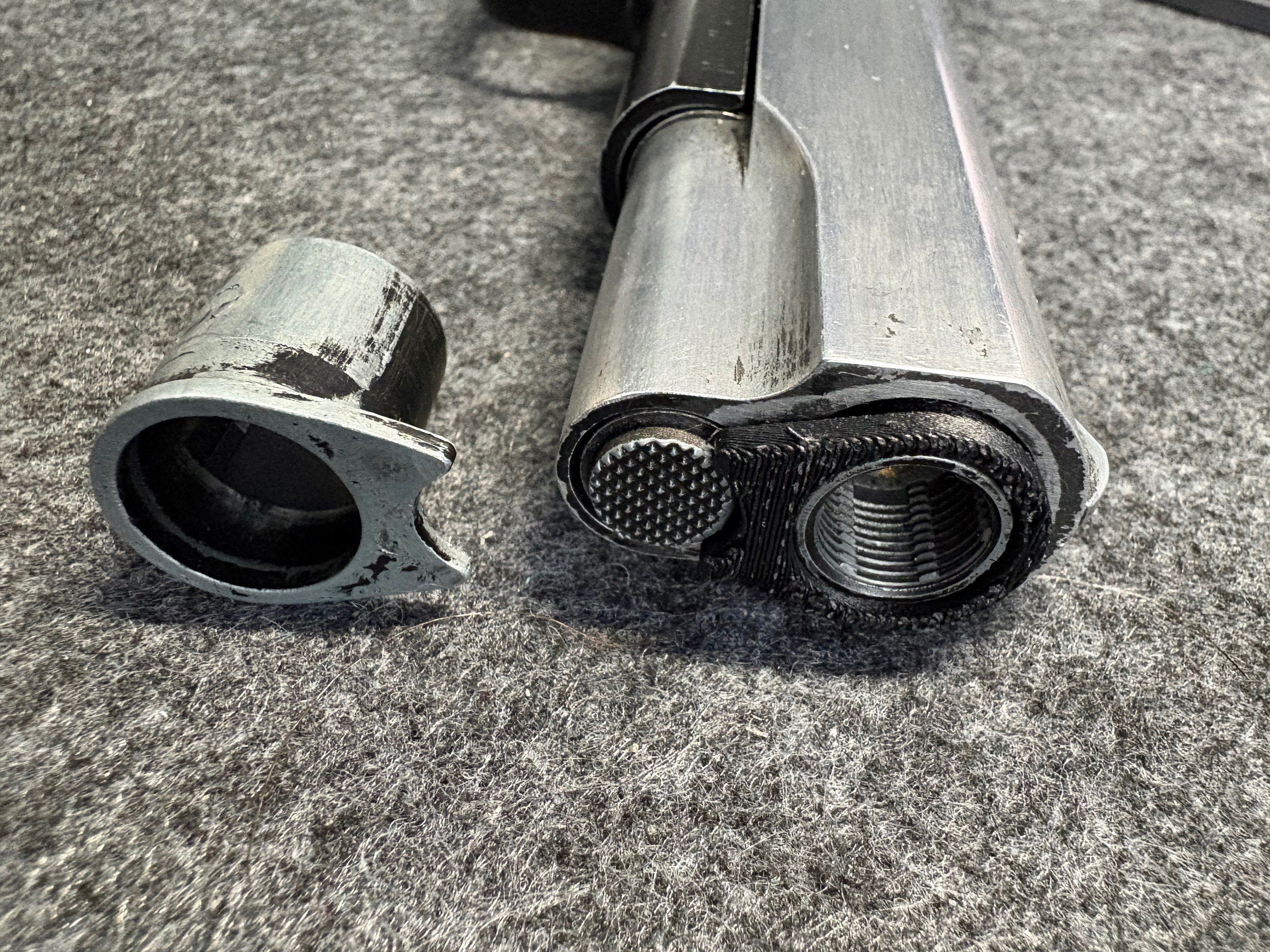 De originele barrel bushing is vervangen door een 3D-geprinte barrel bushing. Werkt gewoon goed en beïnvloedt de prestaties niet negatief.
