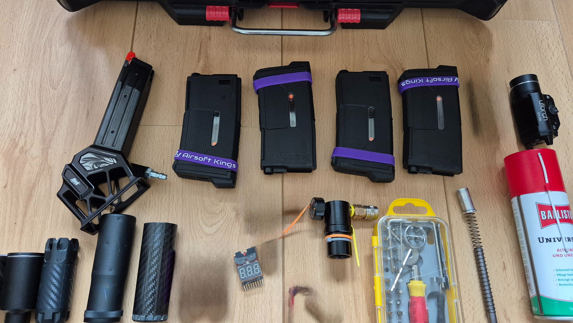 of een complete starter set, replica, adapter, hpa fles, slang, regelaar, tracer, poutches, m4 mags.