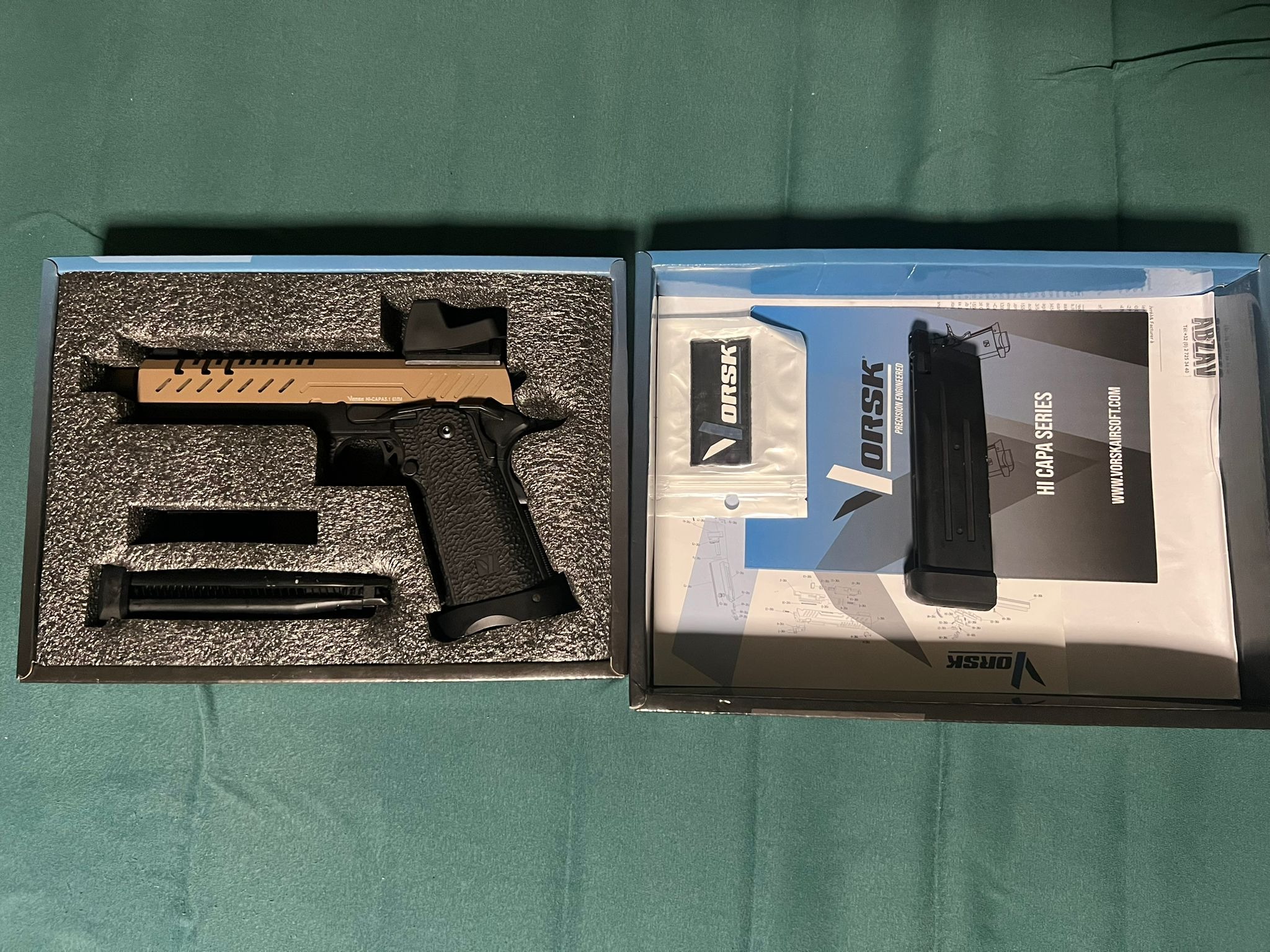 • 🔫 Vorsk Hi-Capa 5.1 GBB – tan/black uitvoering, compleet met originele doos, handleiding en extra magazijn. Praktisch nieuw. Met red dot