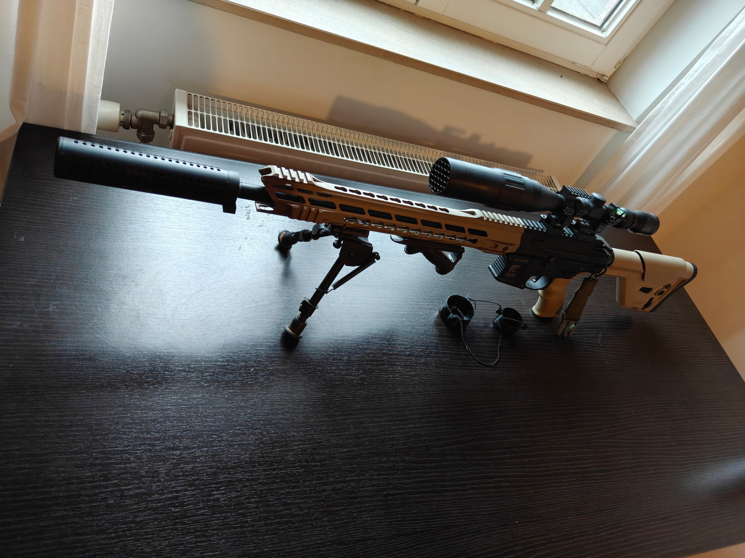 - Accessoires: Bipod (verstelbaar), Angled foregrip voor betere ergonomie, Mock suppressor (demper), Tactical sling (groen, bungeestyle).