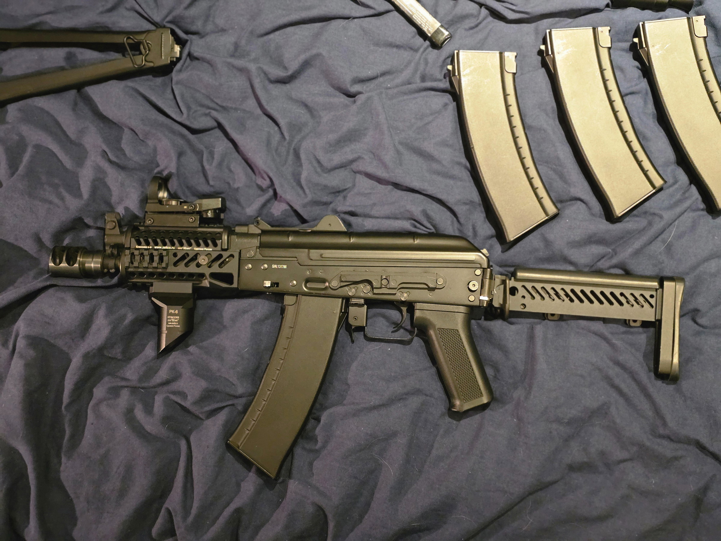 Met red dot, originele stock, 3 midcaps en 1 hicap mag + lipo, originele cyma handguard ben ik helaas kwijt.