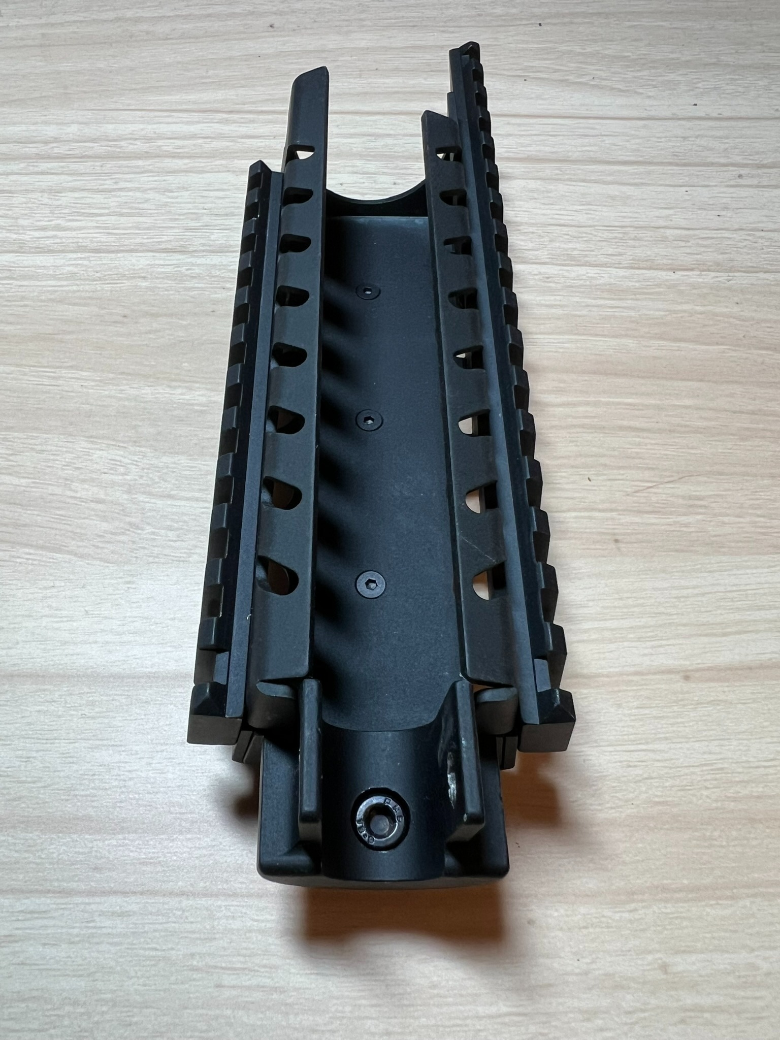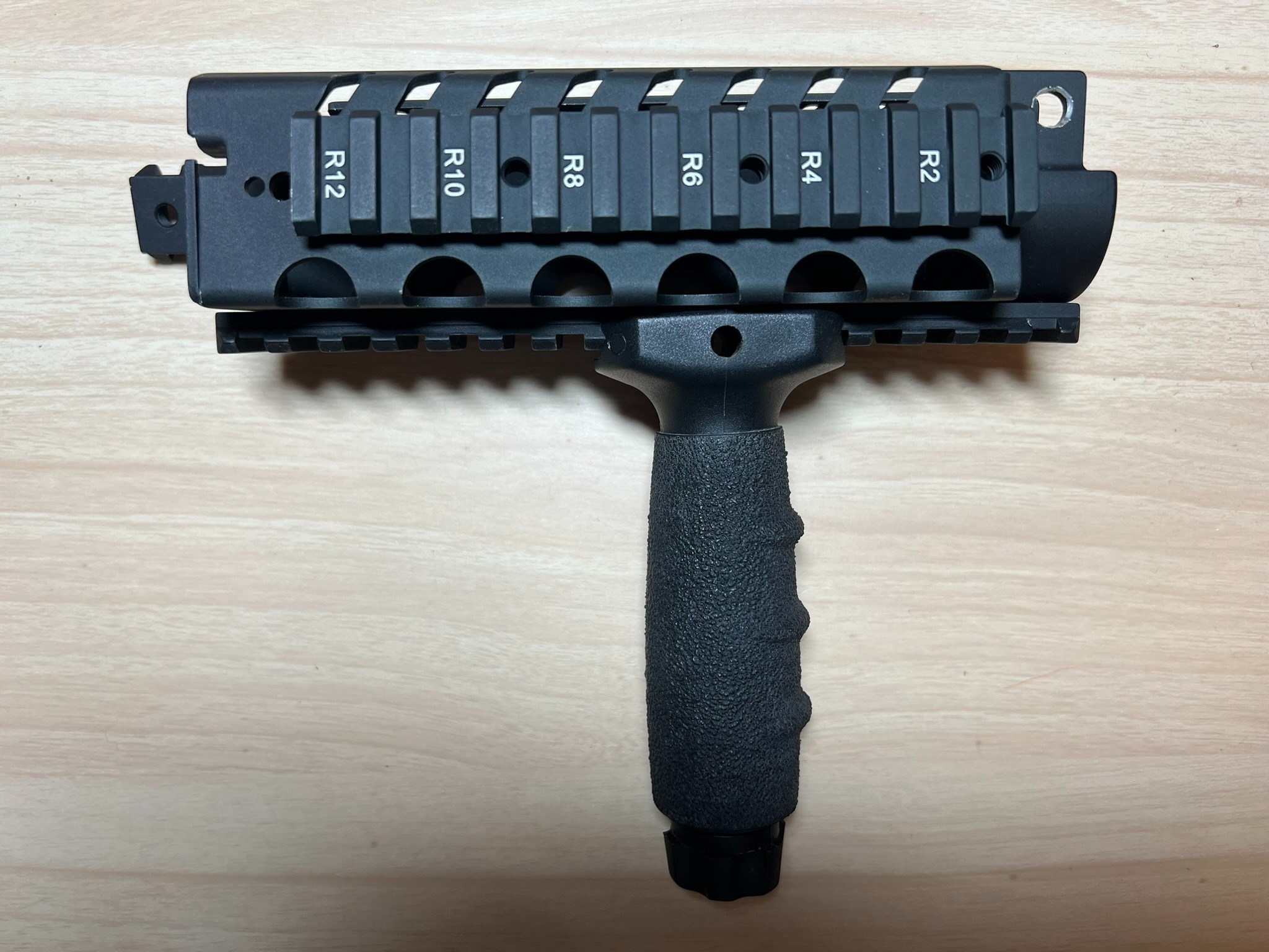One side rail was shortened so you can use a folding stock. Foregrip with sleeve is included.