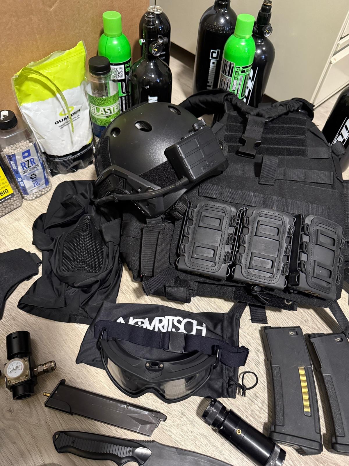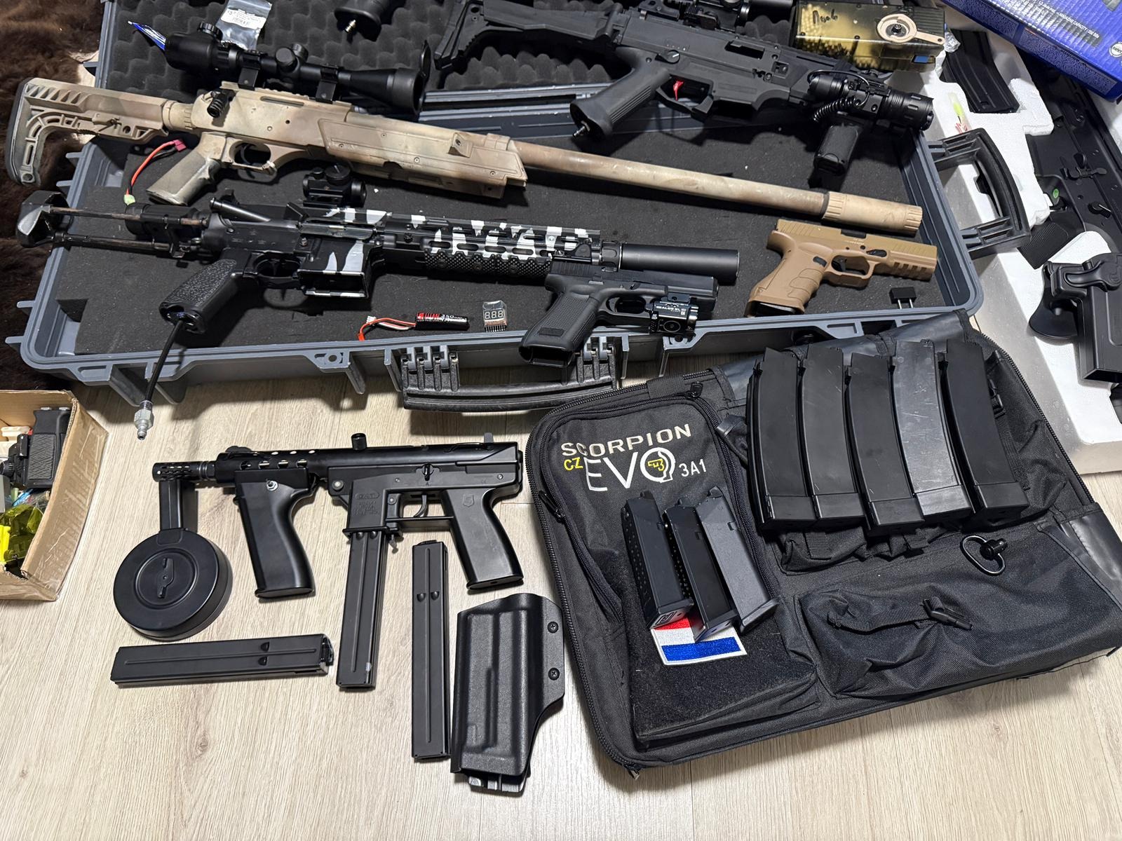 - upgraded Scorpion evo hpa  incl tas 5 mags maxx hopup , speedtrigger reddot flashlight met pressureplate etc