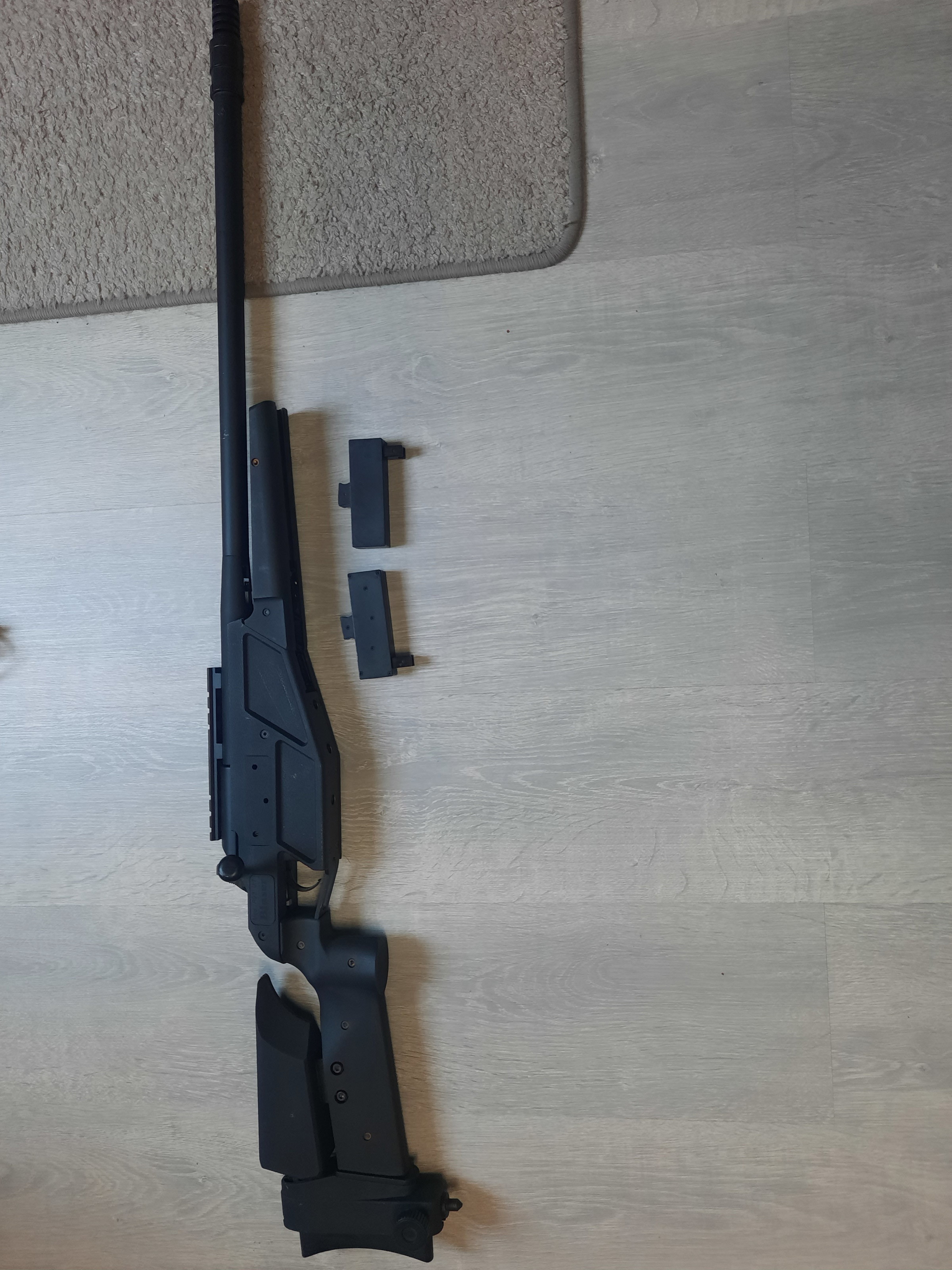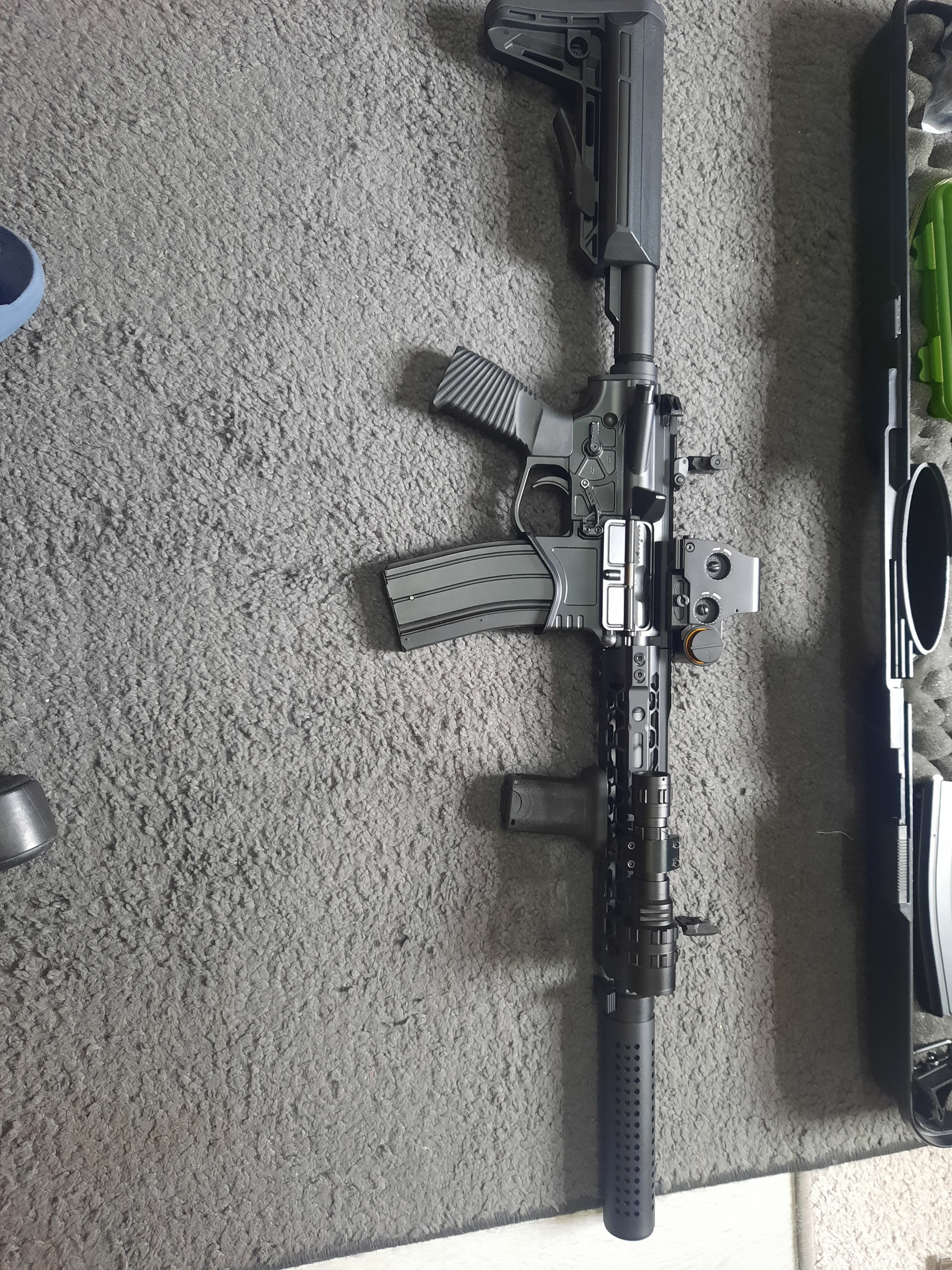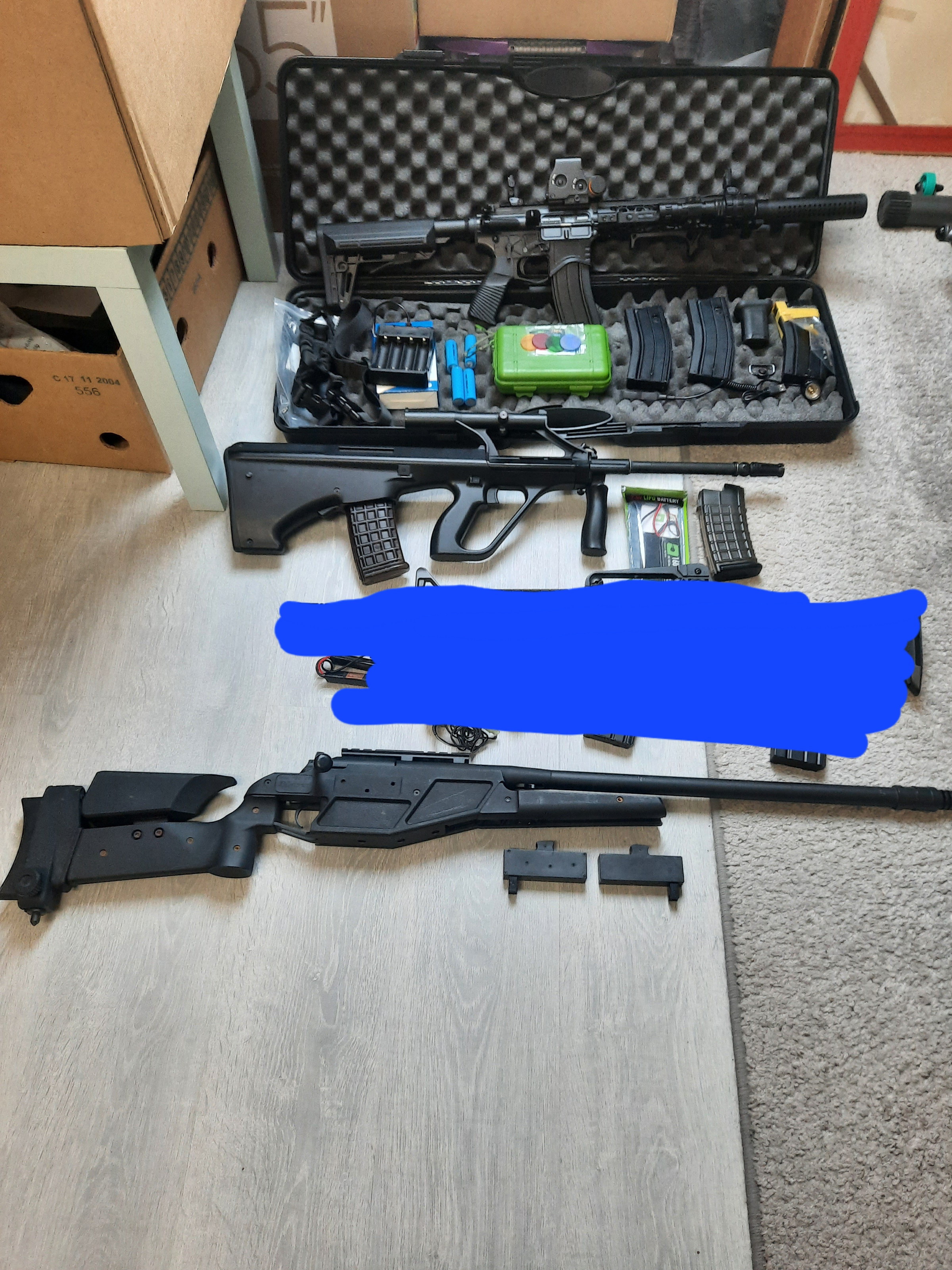 M4( gbbr) met verschillende accessoires: reddot, silencer,2× grip, 3× mag+ 1×mag voor onderdelen,nieuwe riem,tactical lamp met kleurenfilters +4 oplaadbare batterijen en lader,koffer dit alles in zeer goeie staat vaste prijs ( 550€) en heb ik nog een blaser mod r 93( King arms)  in de aanbieding, deze is echter defect ( optreksysteem) voor de handige ( prijs 50€) tot slot heb ik nogwat losse accessoires te koop : scope houder ( nieuw 12€), 2× mag mp5 (aeg) 15€, 2× mag g36( aeg) 15€, rail mp5( nieuw) 10€.