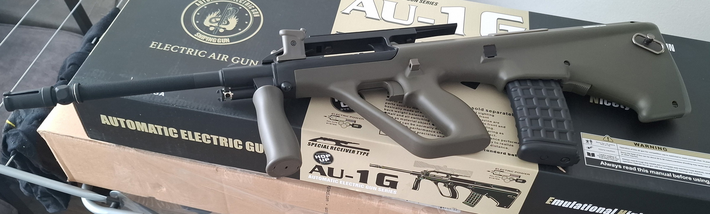 Replica met F mark. Singel shot only. Schiet 1.5 joule. Komt met 5 magazijnen en een lipo batterij.