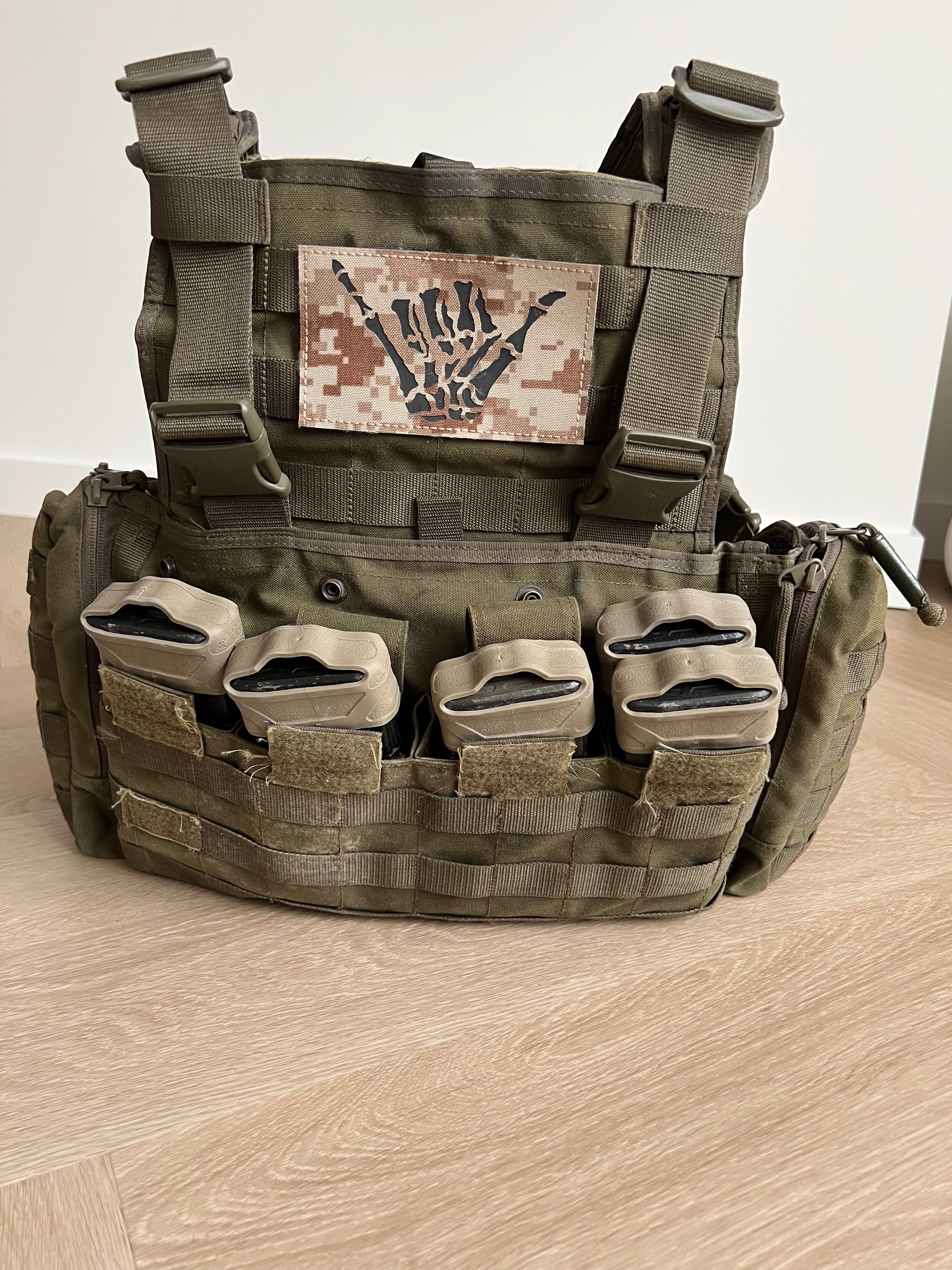 Tasmanian Tiger plate carrier OD green. Plek voor 8 magazijnen, ingebouwde admin panel, twee utility pouches, komt met setje airsoft platen.