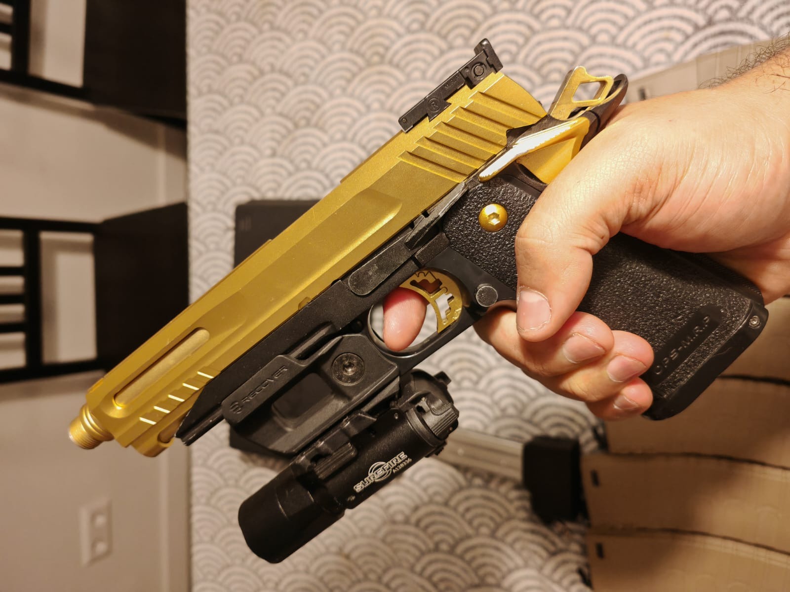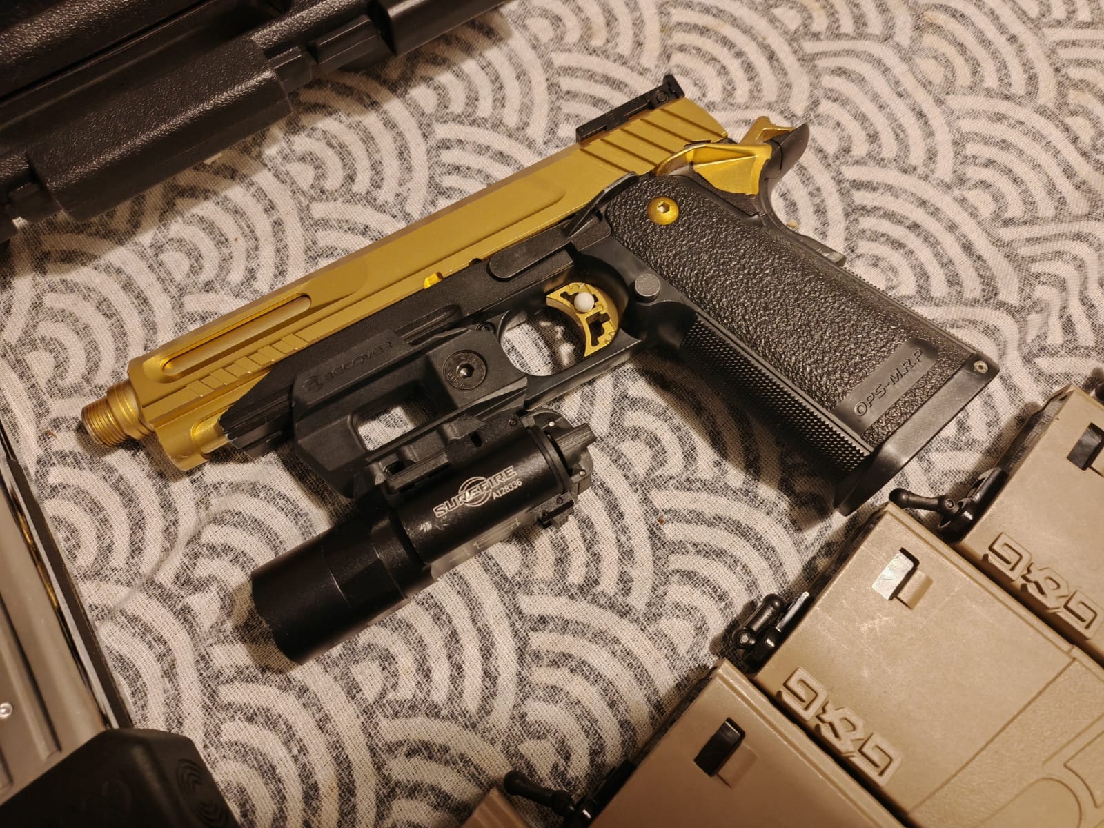 I am selling my beloved Tokyo Marui Hi Capa, I replaced the original slide for a metal slide, I have also done the HPA conversion for the original TM magazine, attached a quick slide holster that works flawlesly, and a surefire lamp (metal) that is great for CQB.