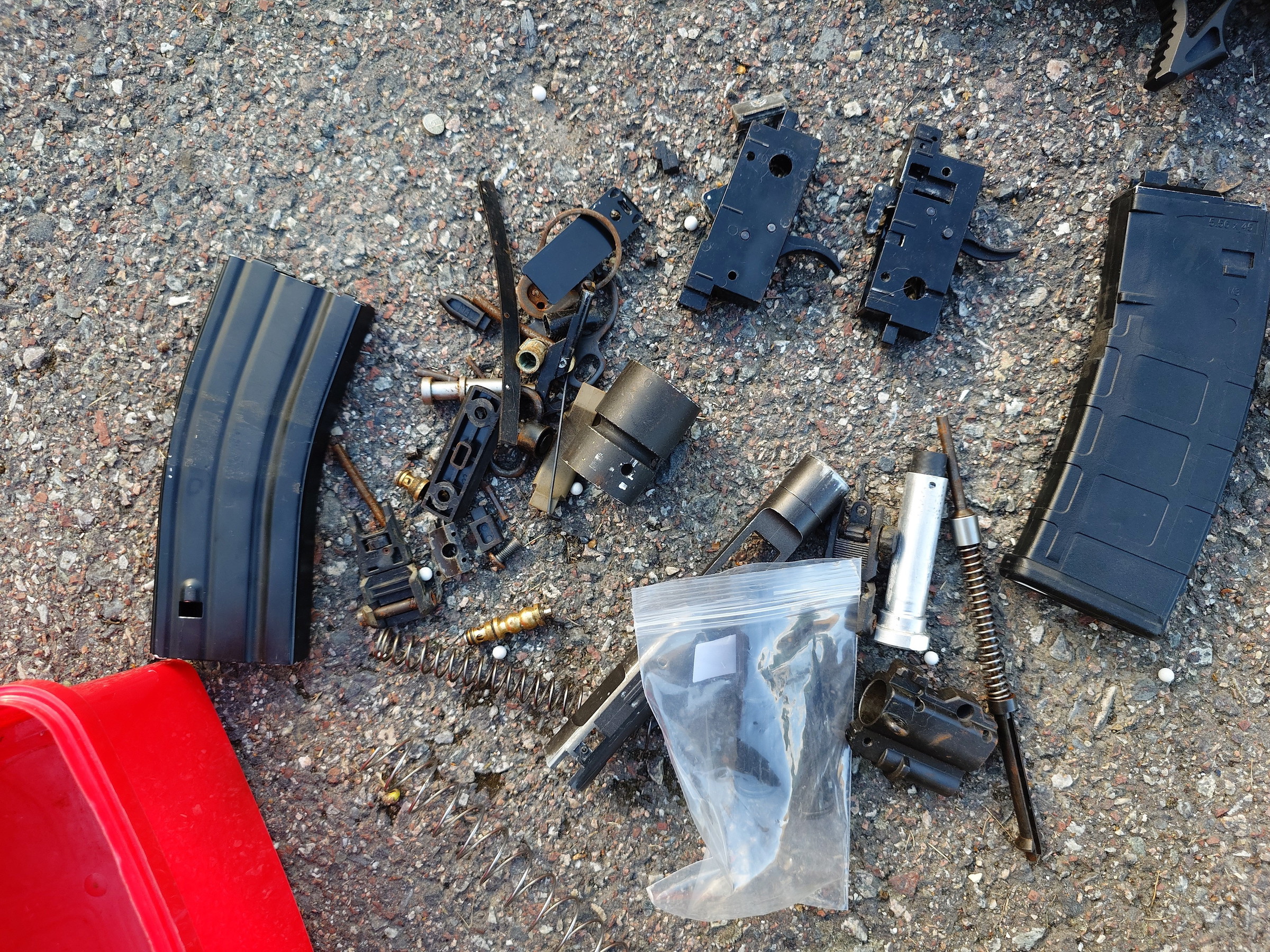 4 "P-mag" where all are tight and work perfectly. New WE nozzle, 2 used in reserve. The gun has been painted by the previous owner and the screw at the back that holds the triggerbox has had its head drilled out, I lack the tools/knowledge to get the brass screw out safely but the gun works as it should as the fire selector and the "hammer pin" hold the box in place. HPA setup connections. Various hoses and loose parts are included. Pressure gauge has done its job on the regulator. The tanks wont be included in this deal. The drum mag feeds as it should. Looks at the pictures for clarification about whats included and offered.