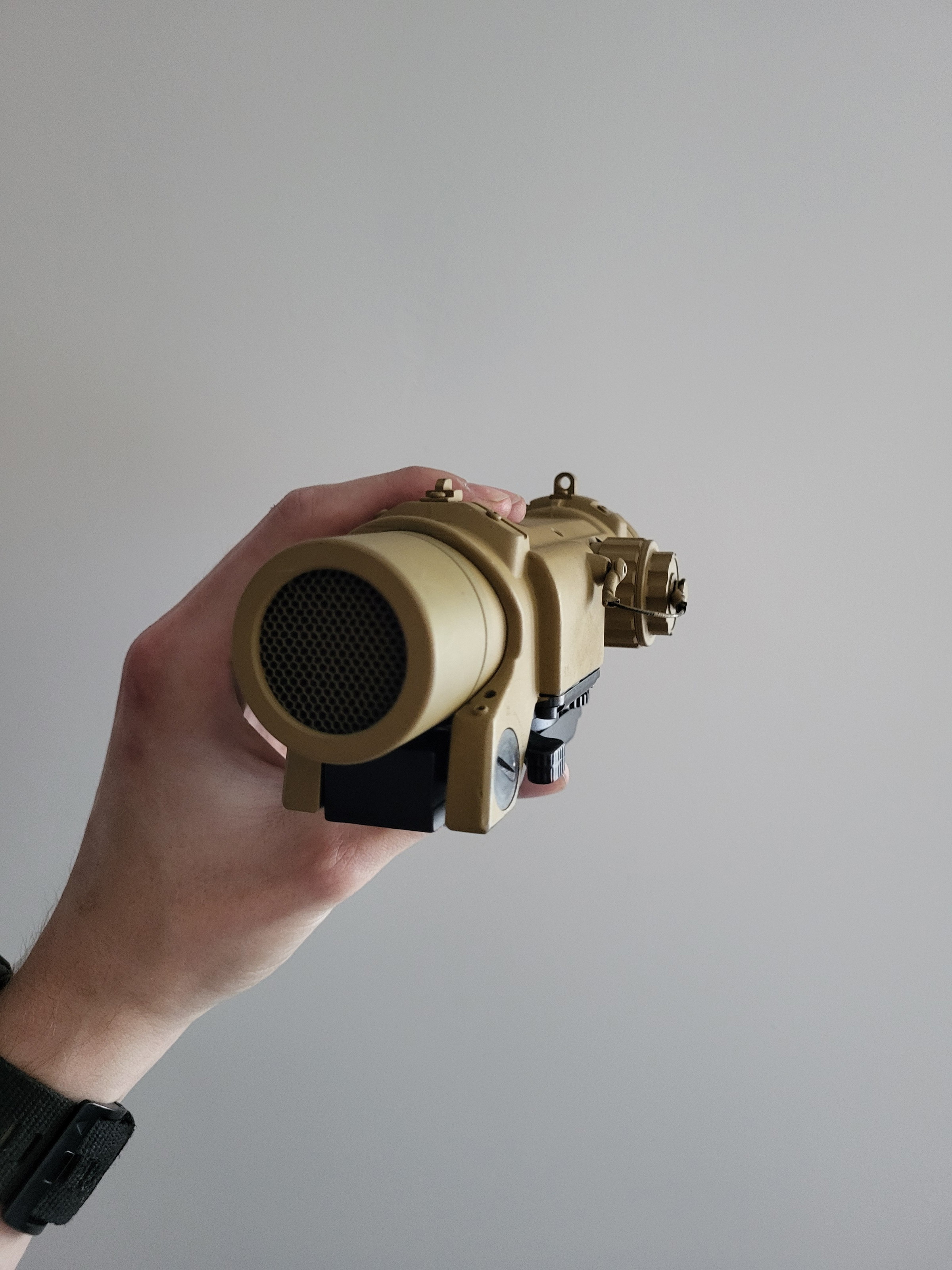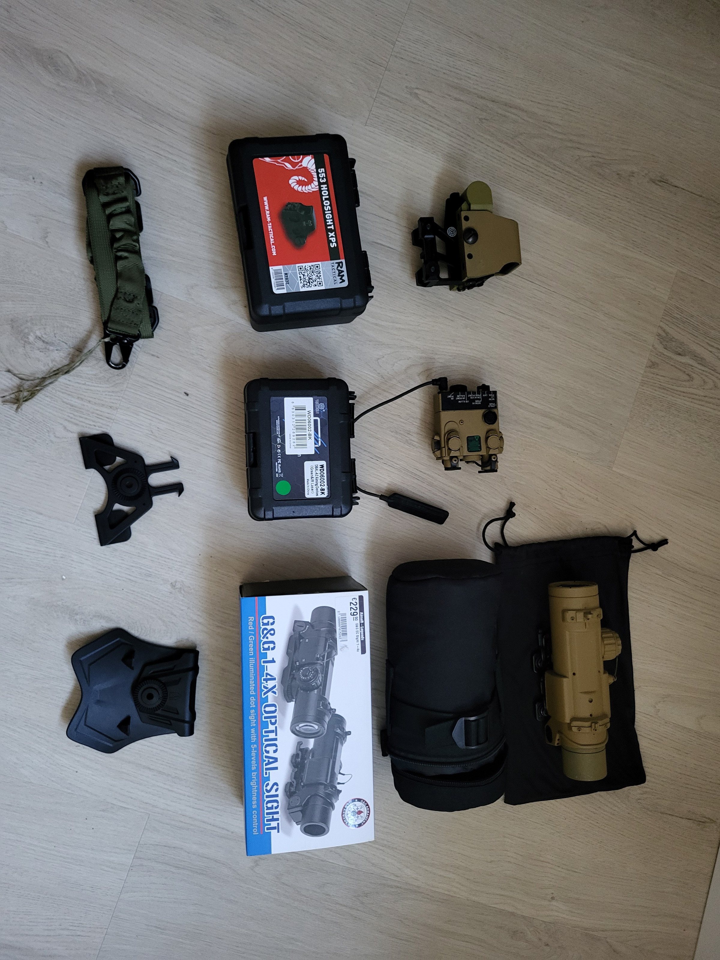 Alle attachments werken naar behoren en zijn Coyote Brown gespoten. De holosight heeft verschillende helderheden en kan tussen rood en groen schakelen. De G&G EC is een fantastische scope voor DMR/Battlerifle setups. Deze scope is robuust en kan daardoor echt wel tegen een stootje. Aan de zijkant zit een hendeltje waardoor je makkelijk en snel tussen 1x en 4x kan switchen, zelfs met dikke handschoenen. De DBAL-A2 heeft verschillende instellingen waaronder Low en high power  hold of switch functie, laser, white light, strobe functie en IR laser. Bij vragen of interesse stuur gerust een berichtje!