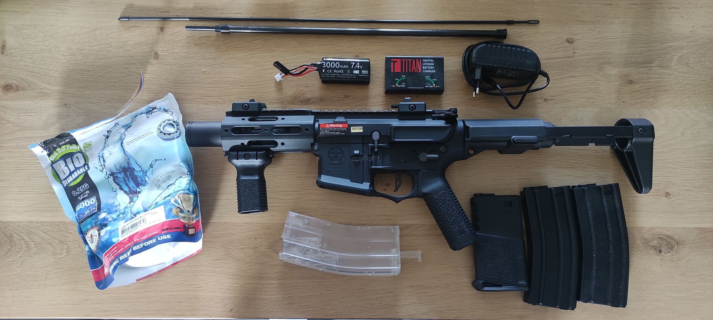 Bij de replica zit er een 3000mAh 7.4 V titan accu + lader, 2 extra magazijnen(3 totaal) en een speedloader.(€320)