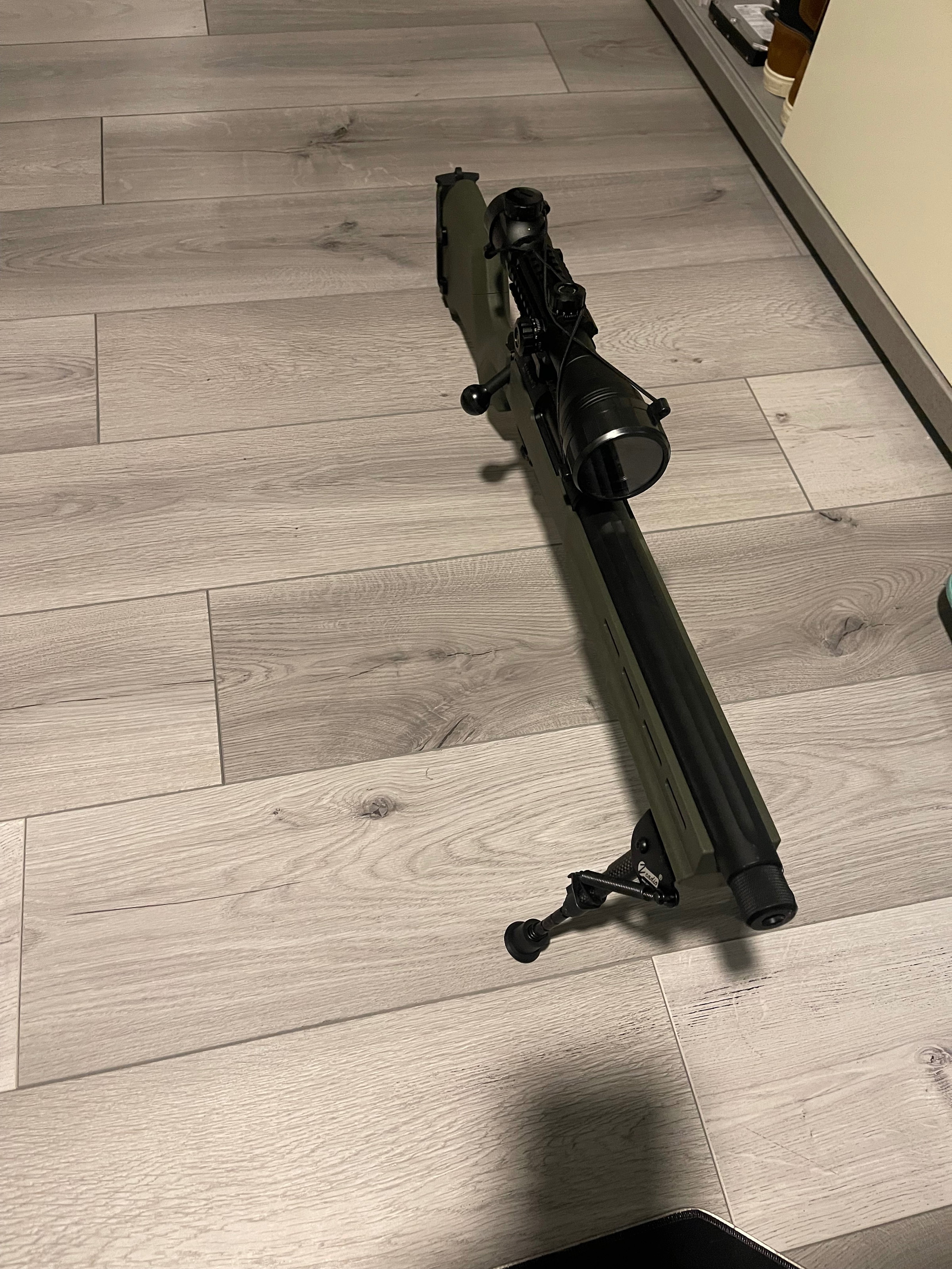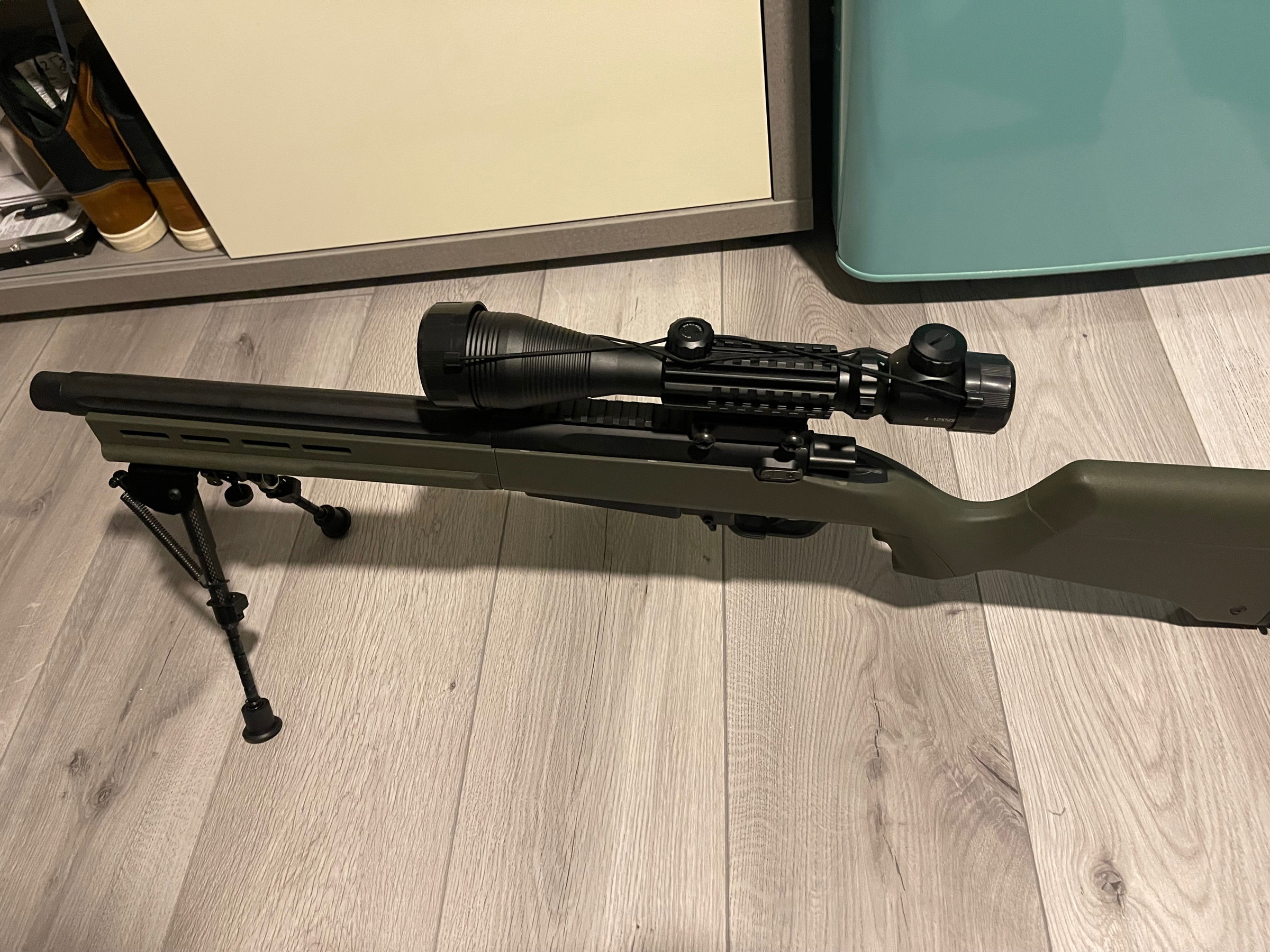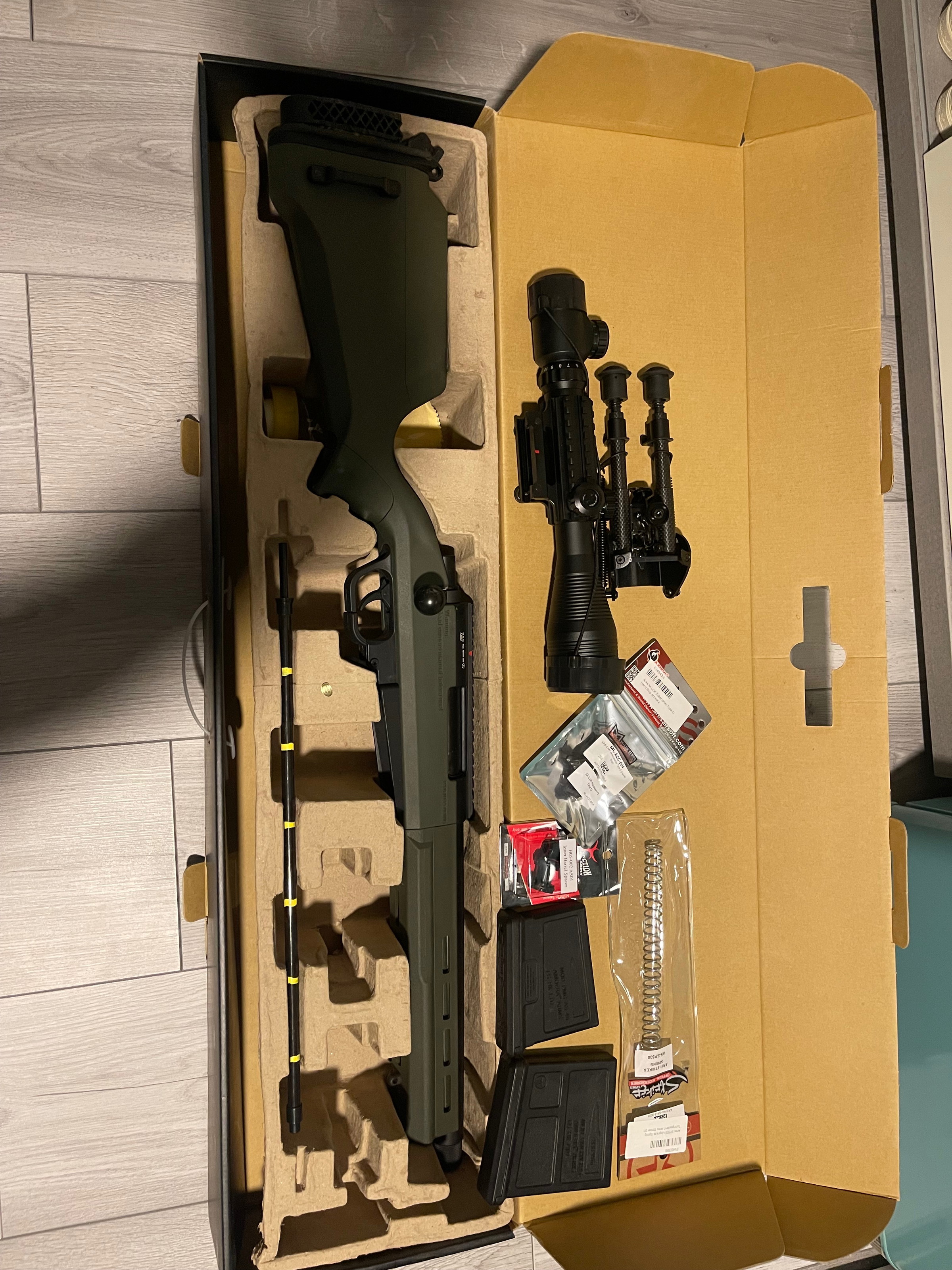 Verkaufe eine neuwertige Sniper Airsoft mit Dreibein,Ersatzmagazin und Zielfernrohr, Siehe Fotos. Zubehör wie eine nagelneue 500er Tuning Spring, Ares Hand Stop und neue Inner Barrel Spacer sind dabei. Die Waffe hat keine 100 Schuss gemacht . Daher leichte Abnutzung am Repetierhebel.