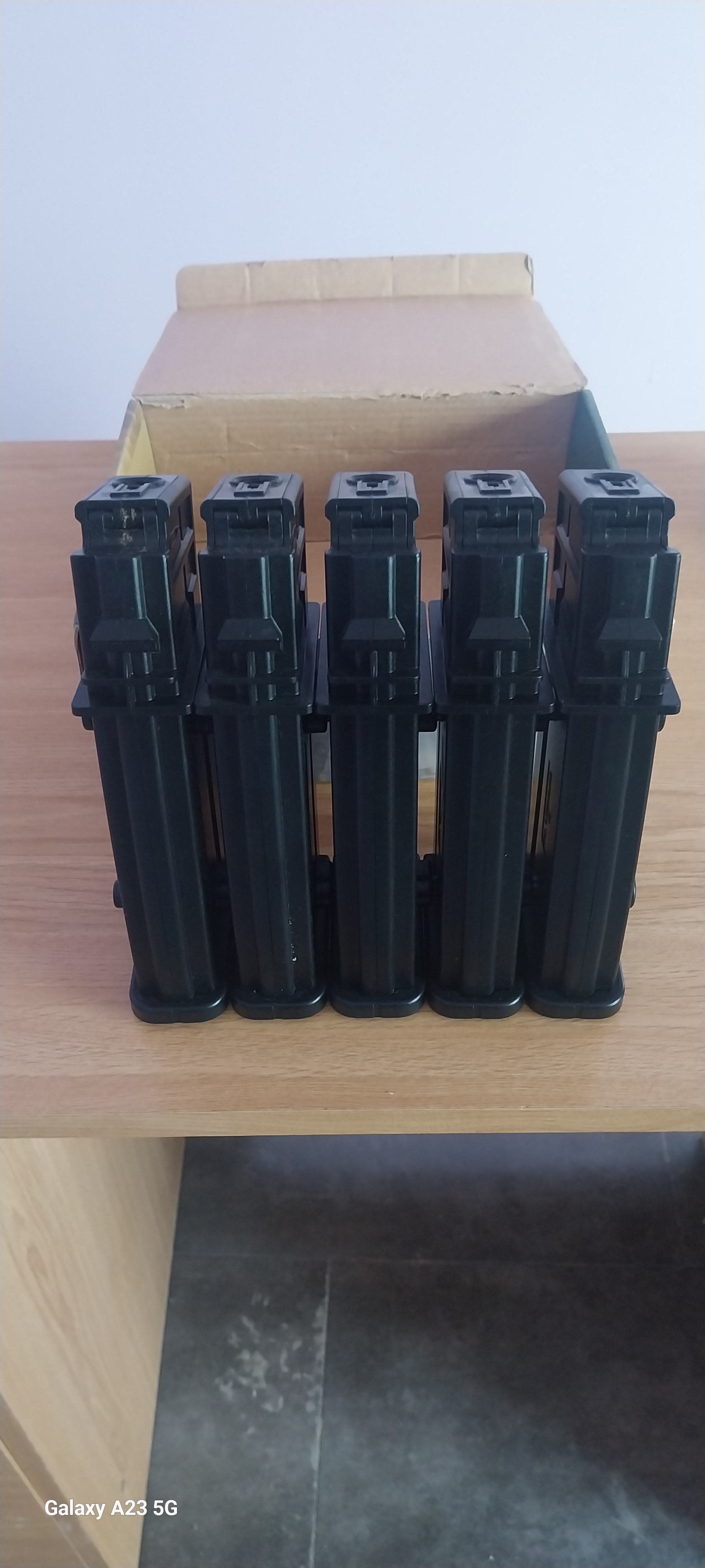 Ademas incluye un pack en su caja original, compuesto de 5 cargadores midcap, 1 cargador hicap y otro real cap que es el que viene con la replica.