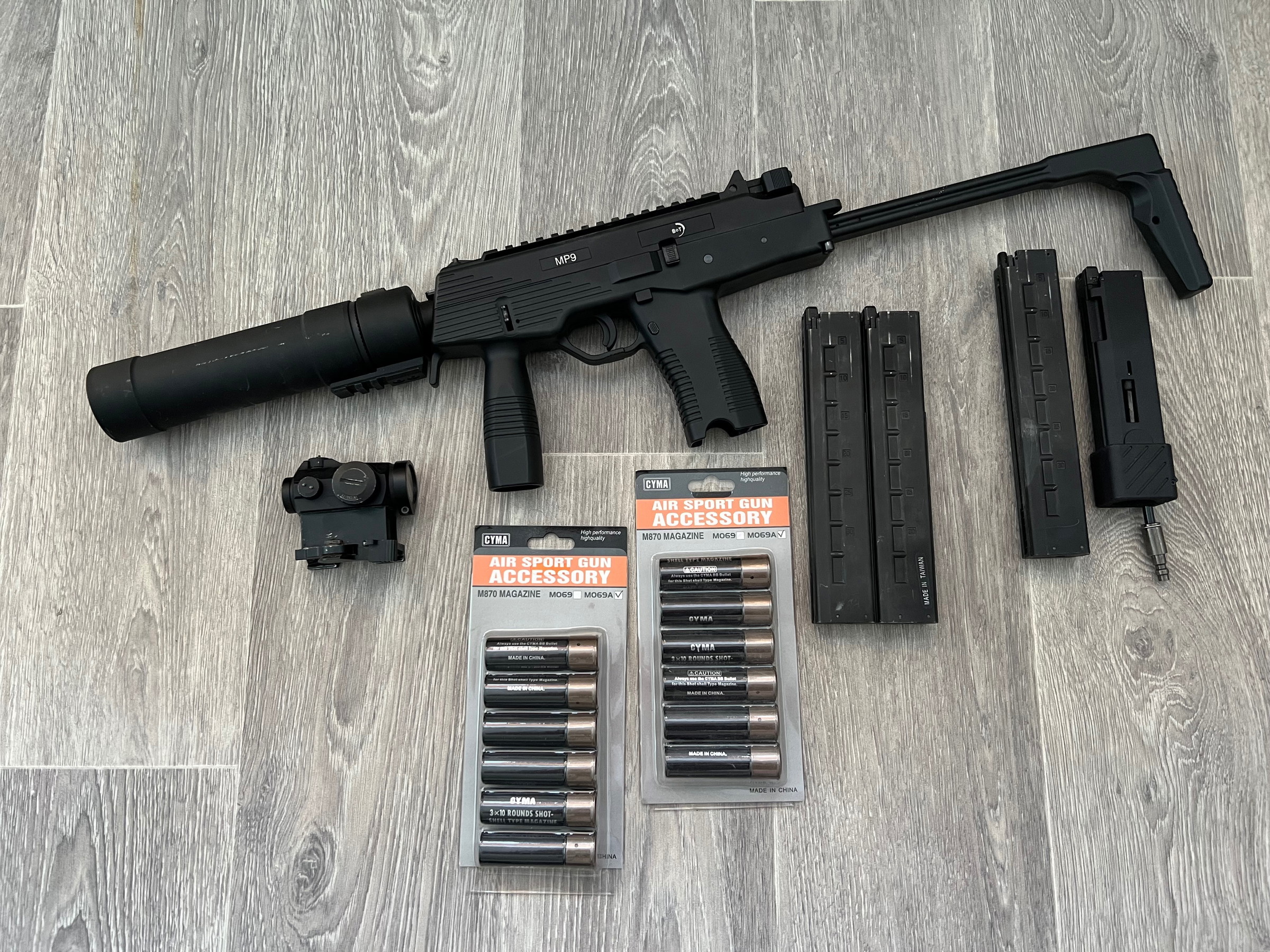 For sale: KWA/ASG MP9 GBB. The gun is fully functional, with no damage, only minor wear from use. Everything shown in the photo is included, except for the red dot sight. The gun can be used both as a GBB and with HPA thanks to an Airtac adapter for shotgun shells. Two magazines are included (both hold gas properly), plus one disassembled magazine for HPA use. Shipping is available.