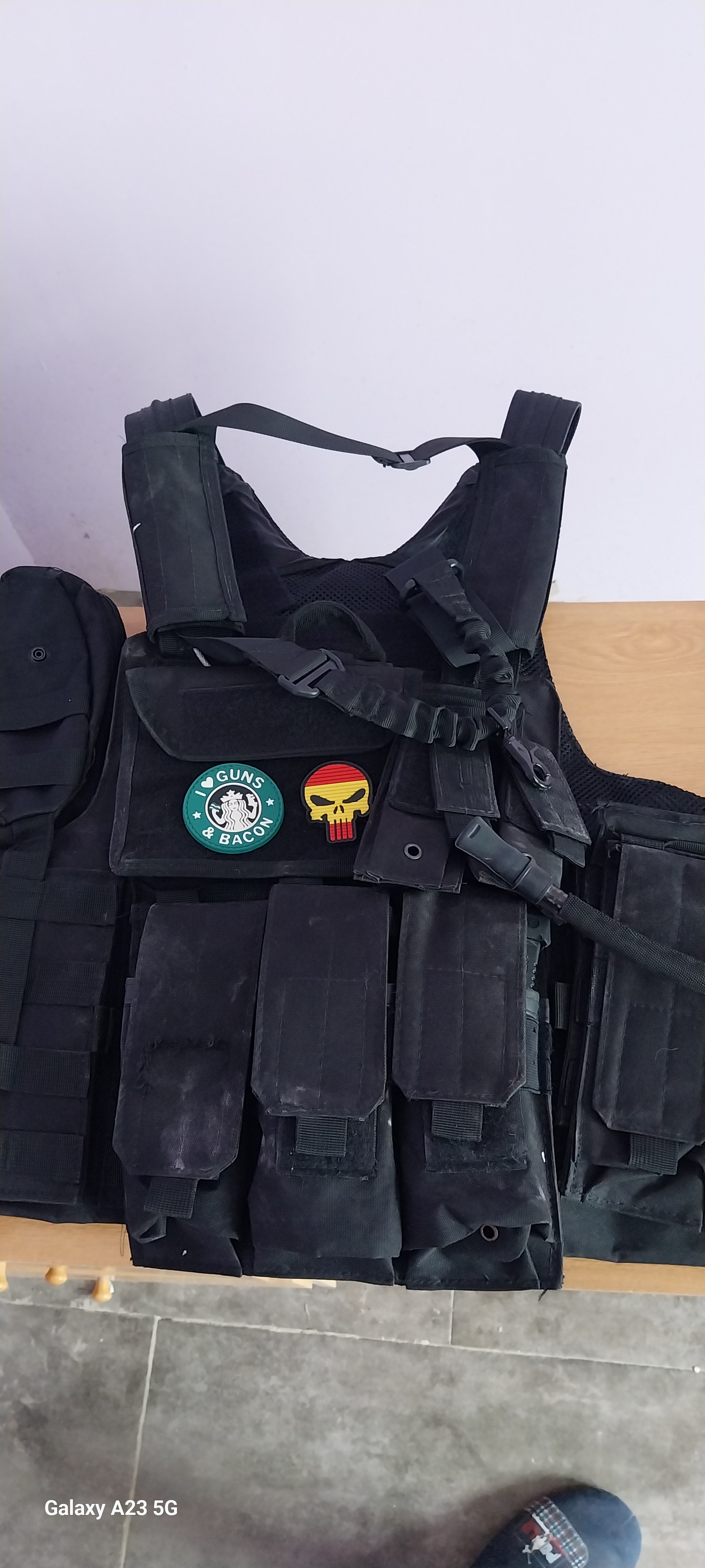 Chaleco táctico completo en color negro, ideal para airsoft. Diseñado con sistema molle para acoplar accesorios.