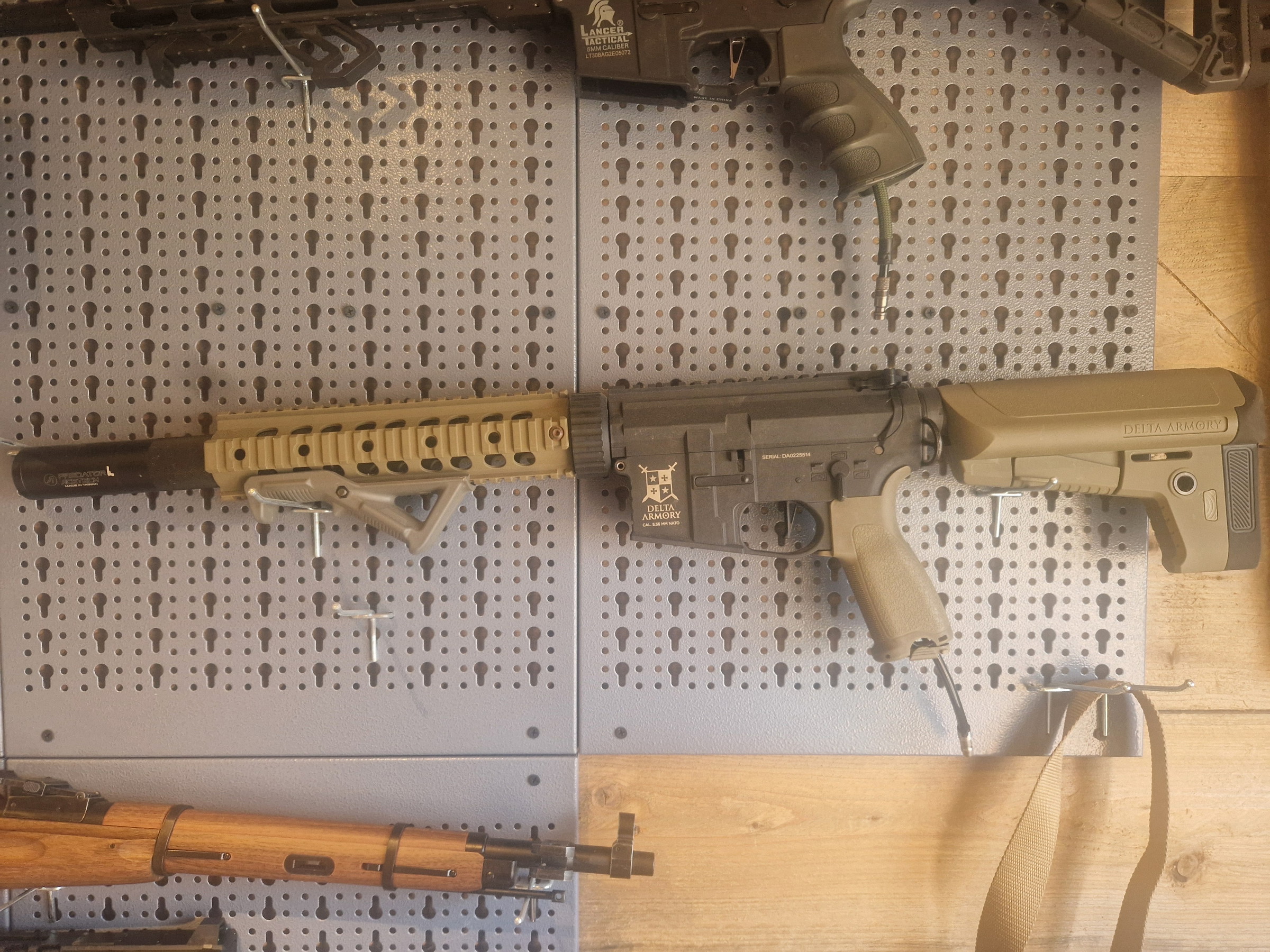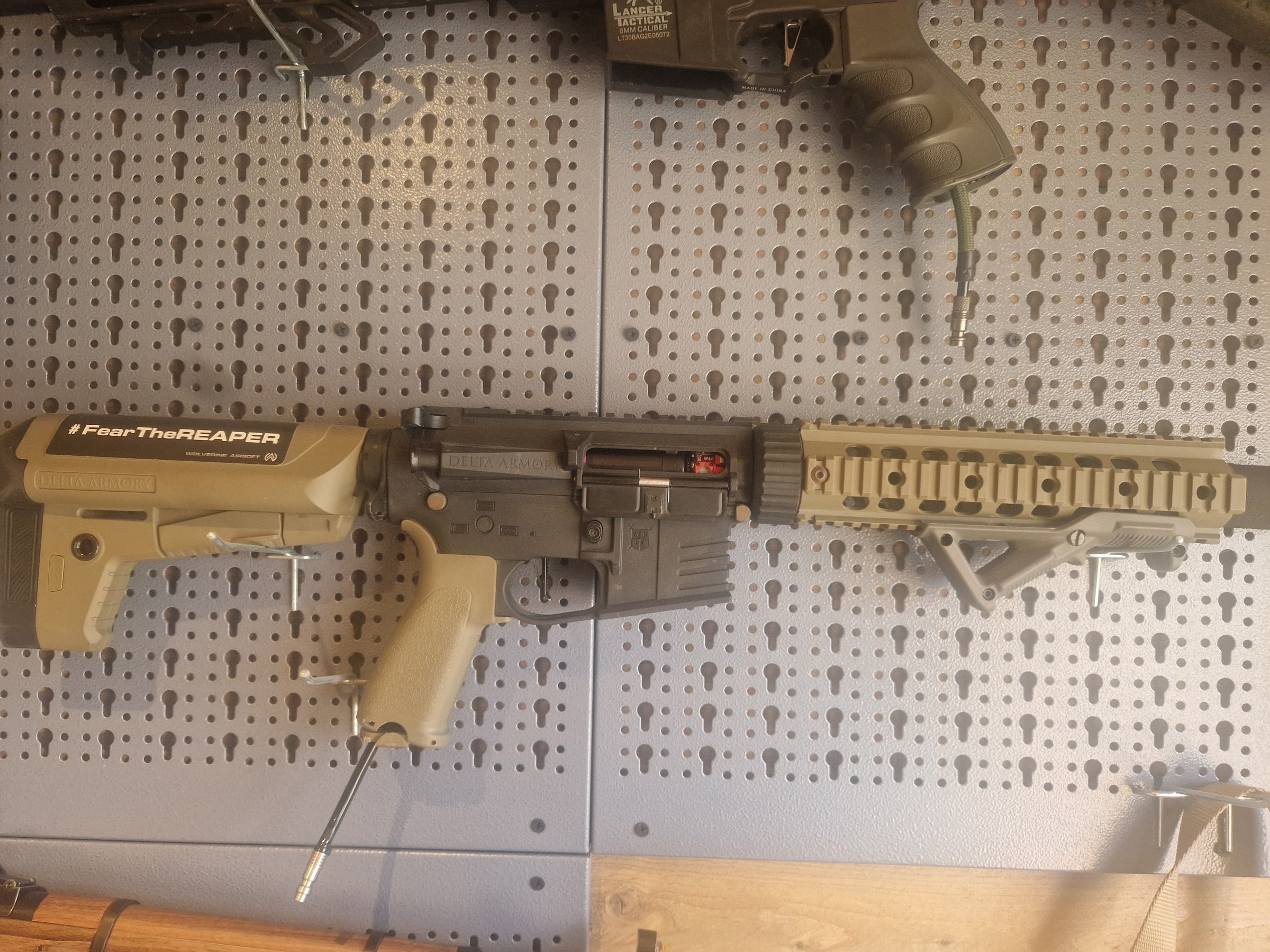 Ik doe met heel veel pijn my custom build m4 weg heel veel plezier me gehad hij shiet zo recht that ik bij copperhead geen full auto mog schiet er zit een max hop up in met een wolverine reaper gen 2 in bukking 60 graden geupgrade barrel ook het come met een magpull hand grip en de suppressor met tracer in in cable van tracer ben ik kwijt