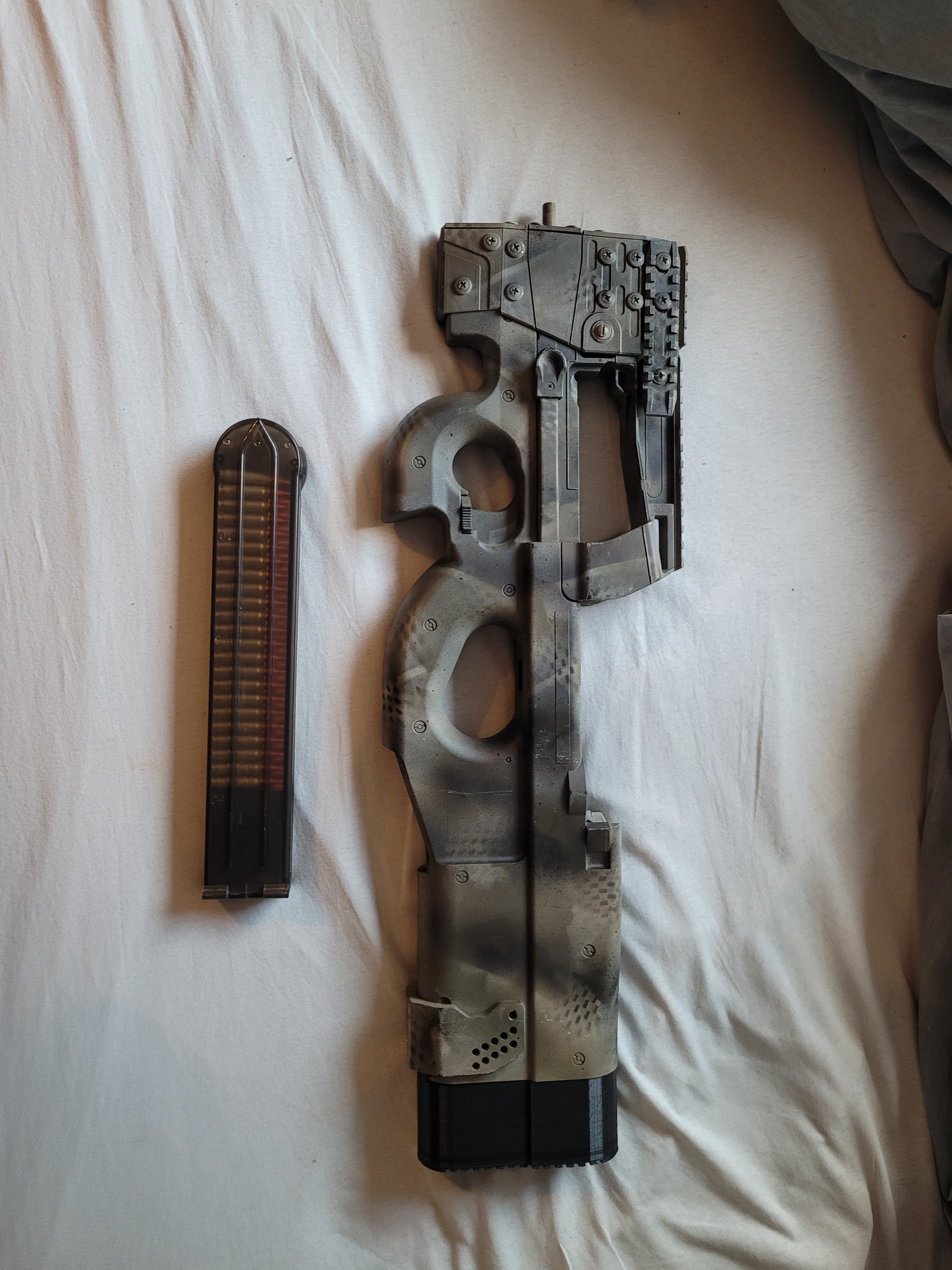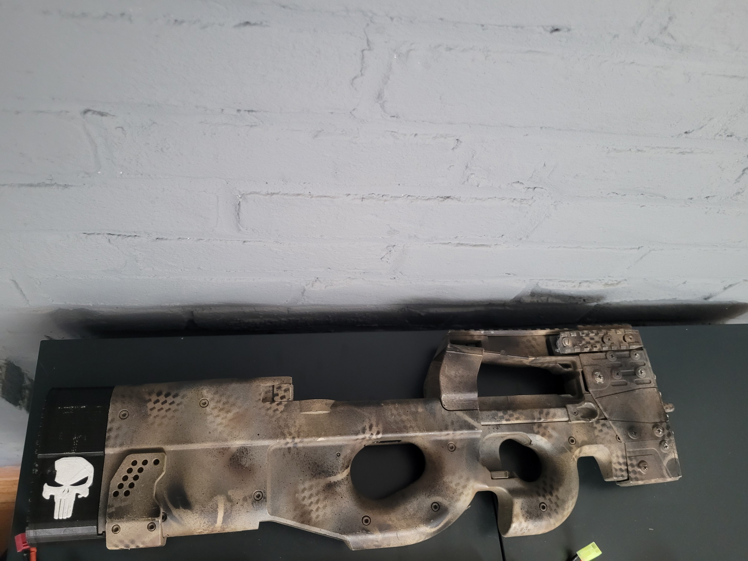 Deze P90 van Cyma mag weg omdat ik er geen plaats meer voor heb. Ik heb hem zelf nog nooit gebruikt, maar de vorige eigenaar wel. Ik heb hem zelf enkel als schouwstuk voor de muur gehad.