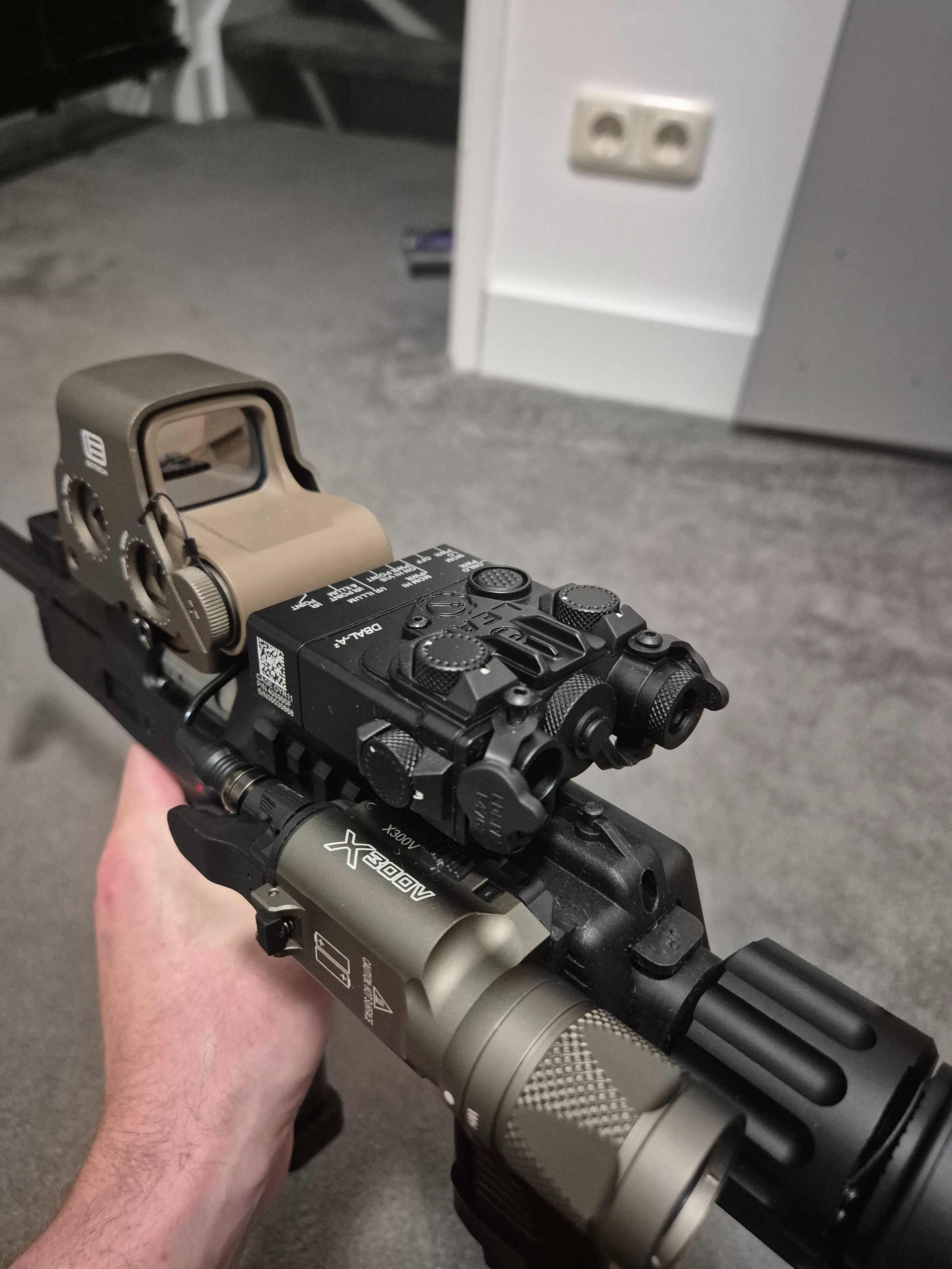 Heeft een metalen behuizing. Absolute nieuwstaat, geen beschadiging en alles werkt. Heeft momenteel een IR lens erop zitten voor de flashlight. Voorzien van de juiste markeringen en inbegrepen bedienknop. Er zit een scalarworks type LEAF front sight op.