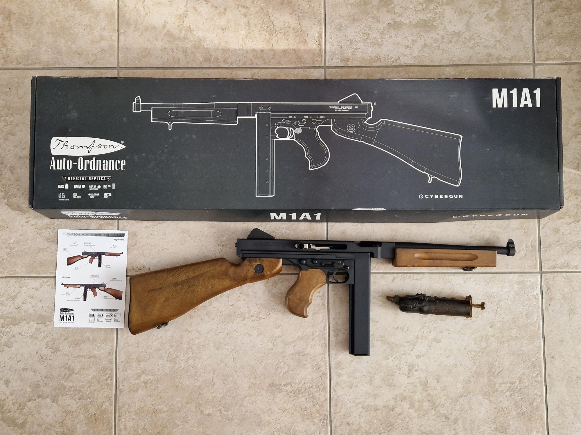 De Cybergun Thompson M1A1 Gas is een GBB (Gas Blowback) airsoft replica die geproduceerd is door WE en gelicenseerd door Cybergun met alle originele markeringen. De replica is vervaardigd van metaal en de kolf, pistool grip en front grip zijn gemaakt van imitatie hout. Ook is de replica voorzien van een keep en korrel.