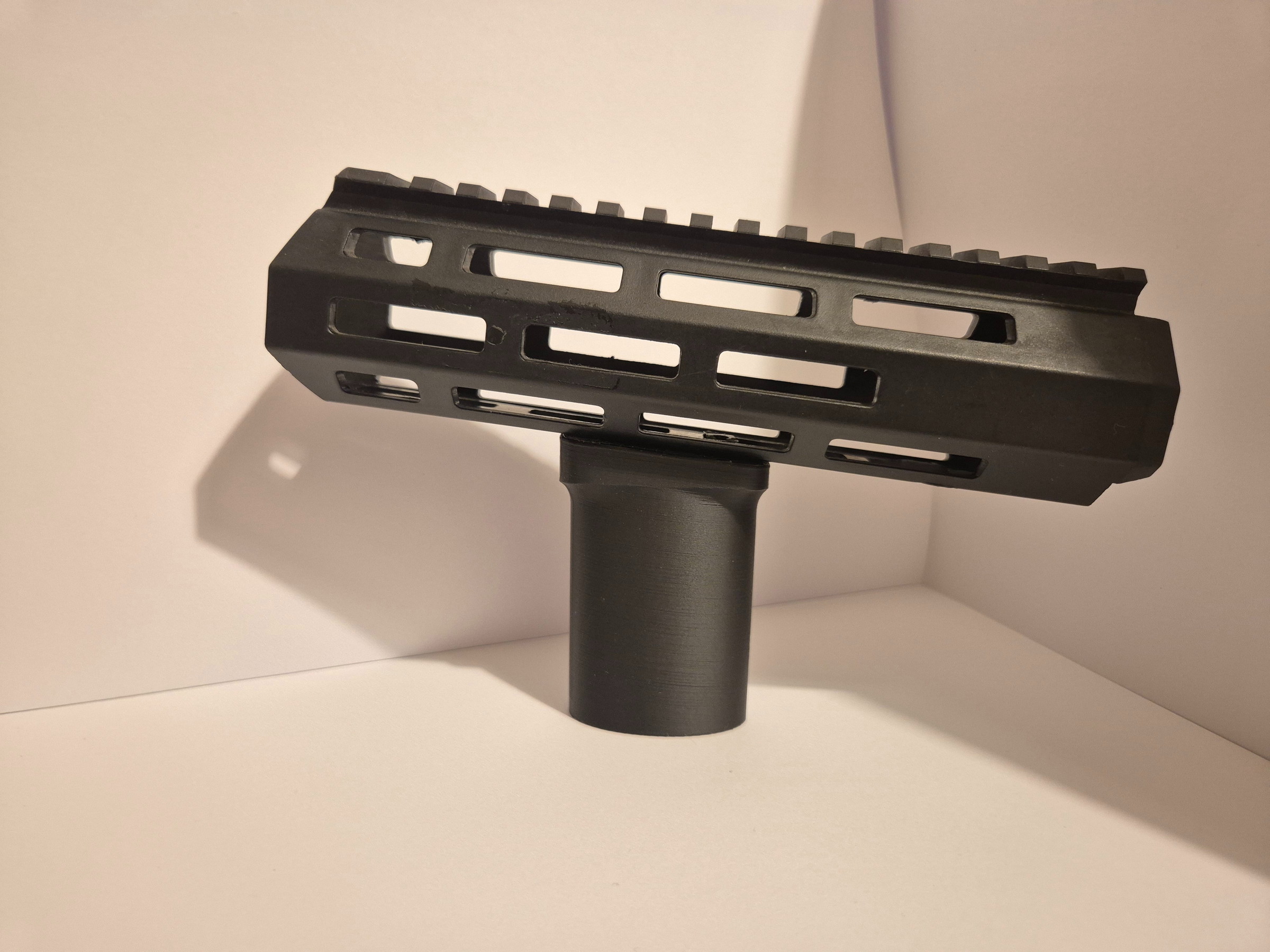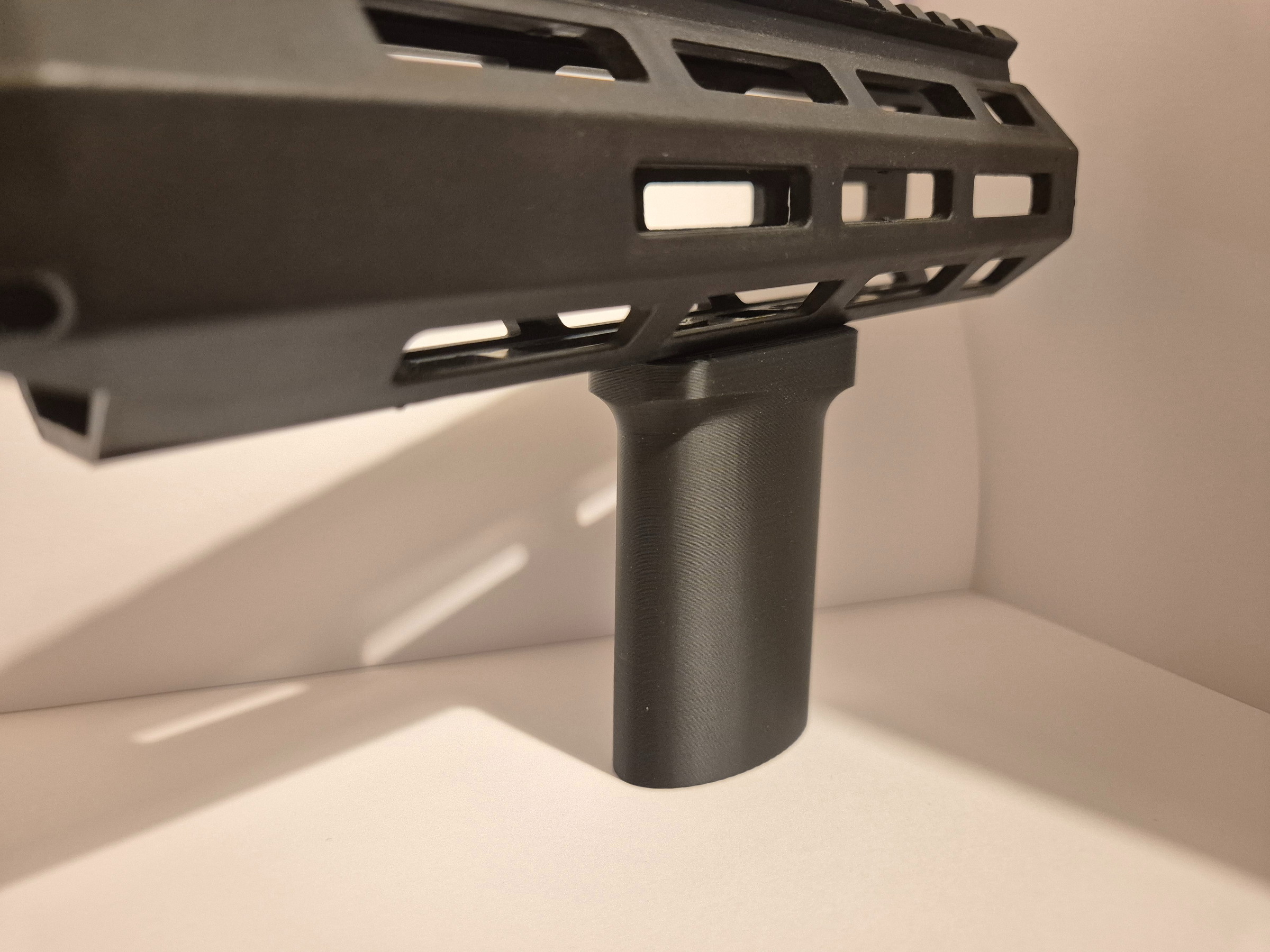 Angled oval front grip by Hostruk mounted on a standard M‑LOCK rail with m4 screws and mounting plates.