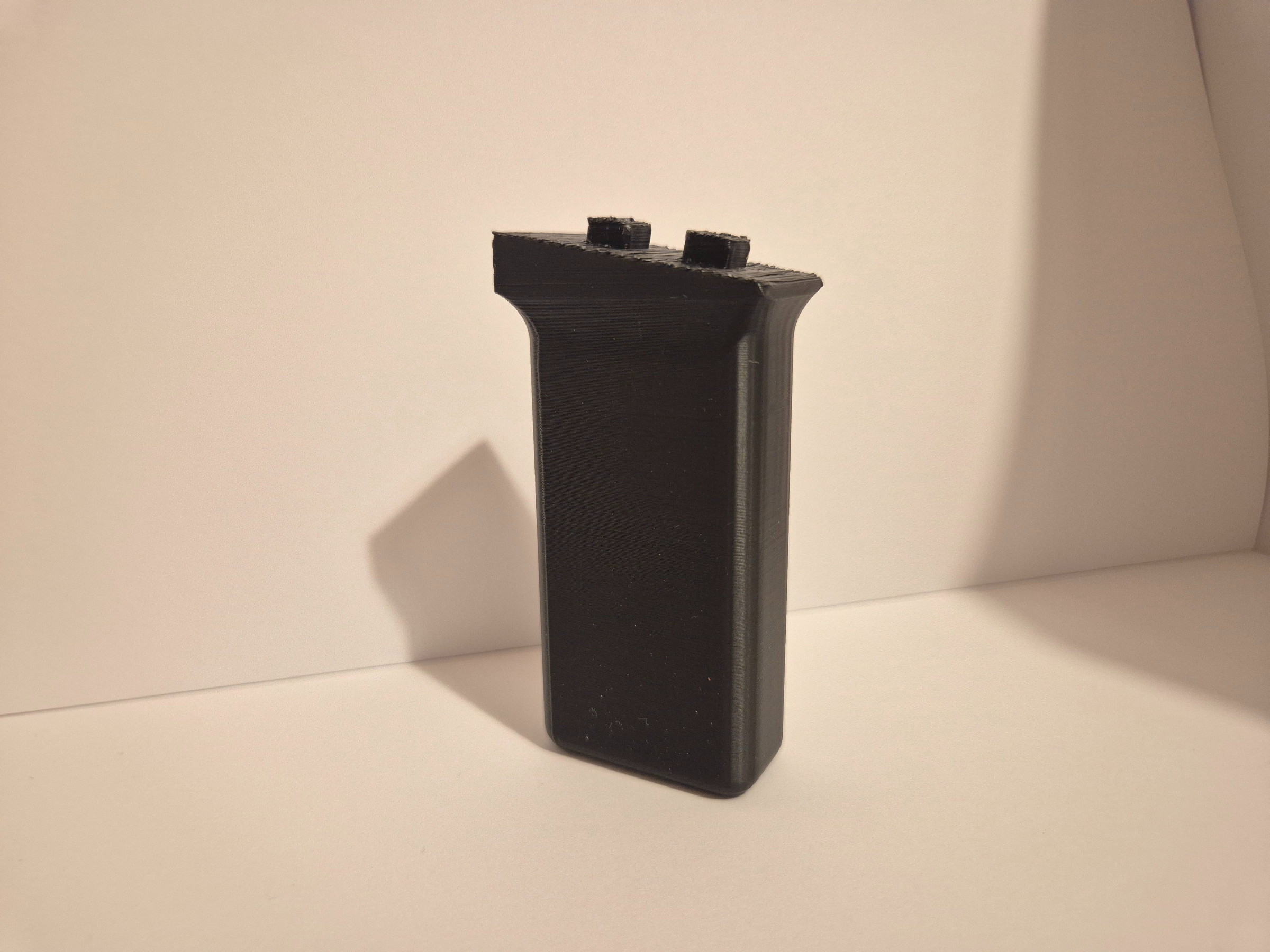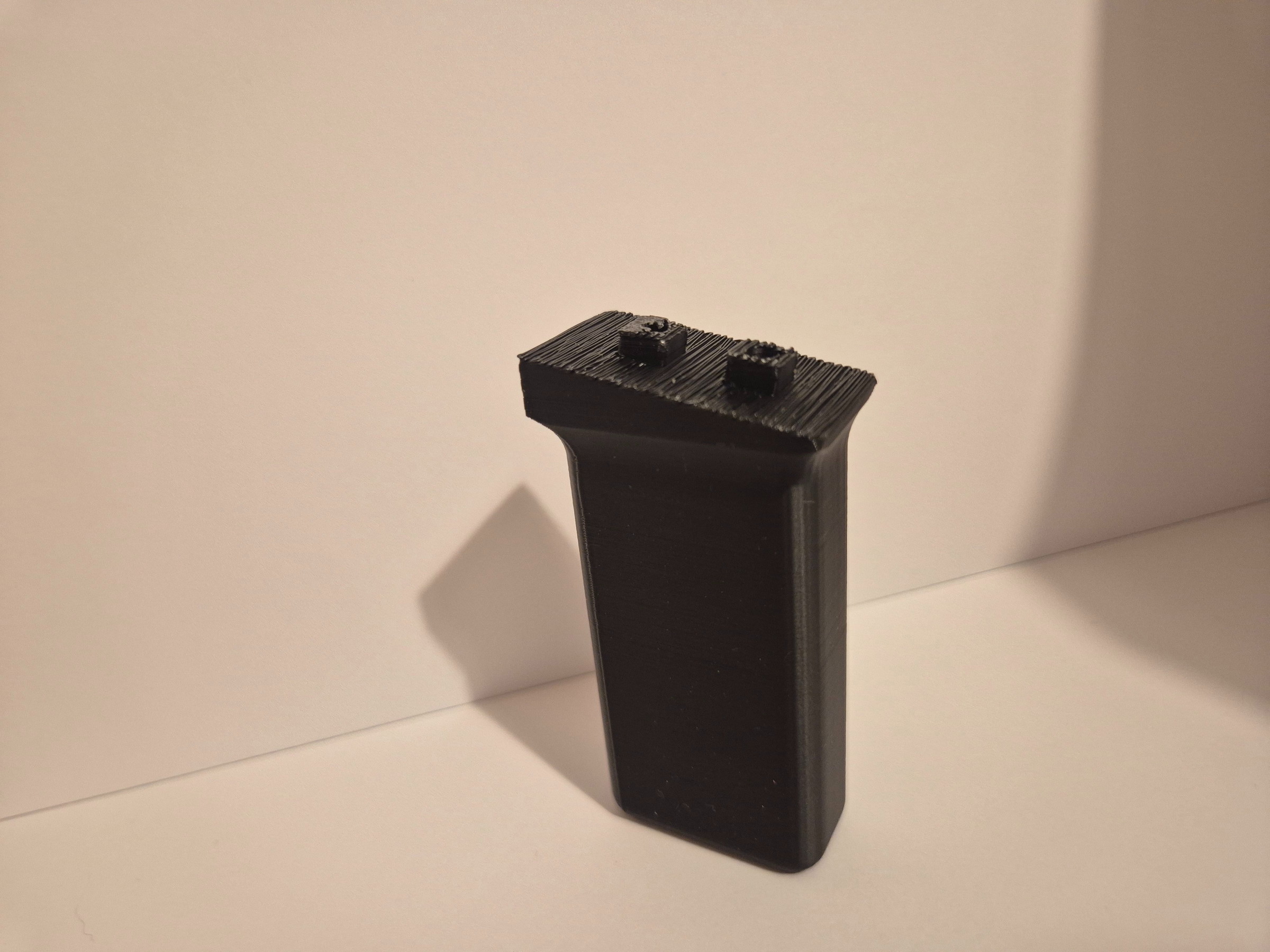 Angled rectangular front grip by Hostruk mounted on a standard M‑LOCK rail with m4 screws and mounting plates.