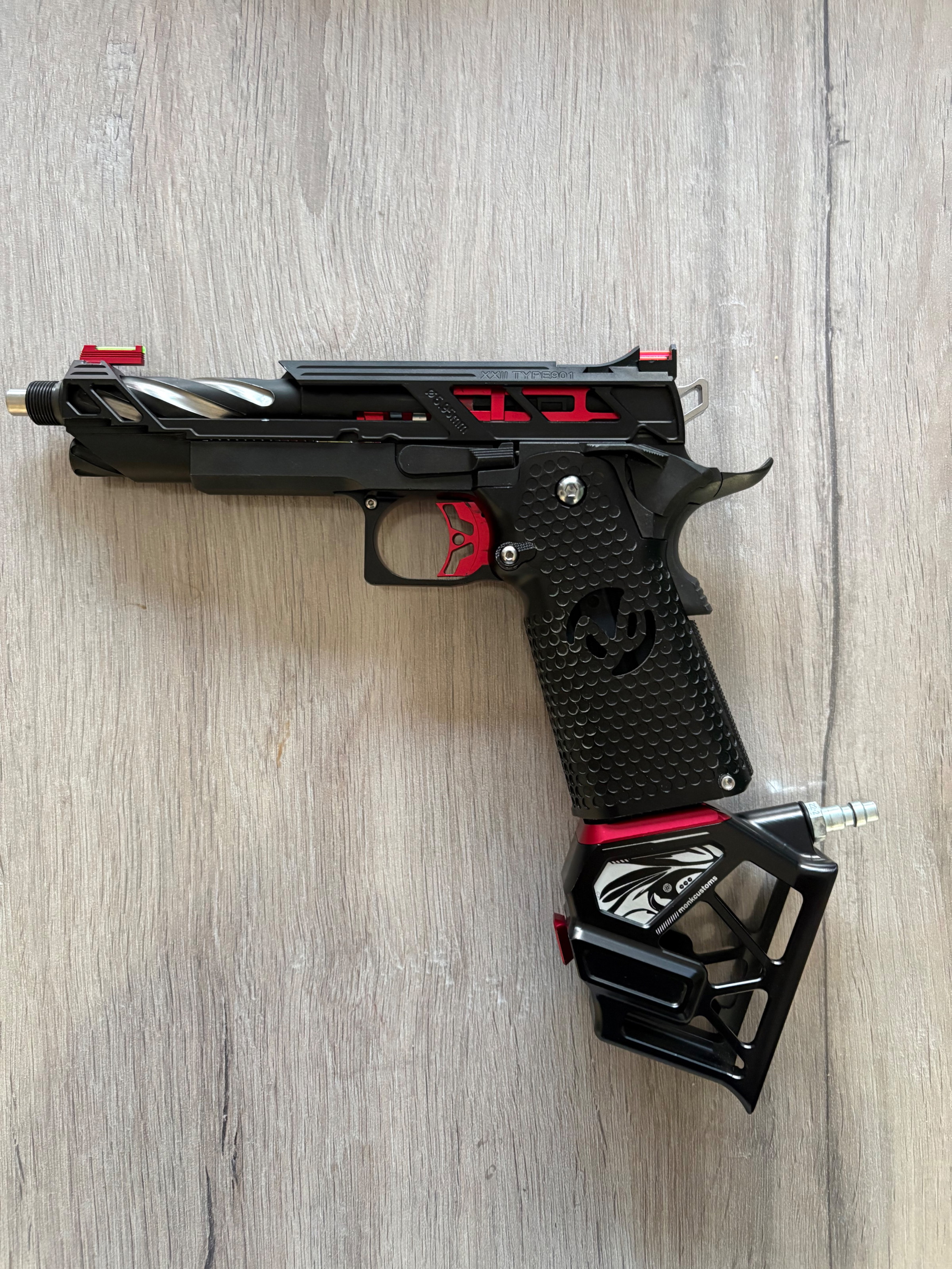 Full opgrade hi capa 5.1 met nog onderdelen bij zoals frame dr black voor er op te zetten en de origenele stukken              Parts                                                                         Loading nozzle , cow cow nozzle value , cow cow nozzle value blocker , inner barrel 138 mm , dr black front sight , monk adapter , masterpiece grip , alu slide dr black 901 , alu frame dr black 02 , alu hammer style red , alu hammer protection red , custom blowback housing red , red speed trigger , tti infinitie hop up chamber , edge blowback housing en nog veel meer dat ik ben vergeten ?  Word als een gans pakket verkocht weg wegen uitdunnen collectie heb je nog vragen stel ze gerust  Of ruilen tegen een heretic word overwogen ? Lieft verkoop …