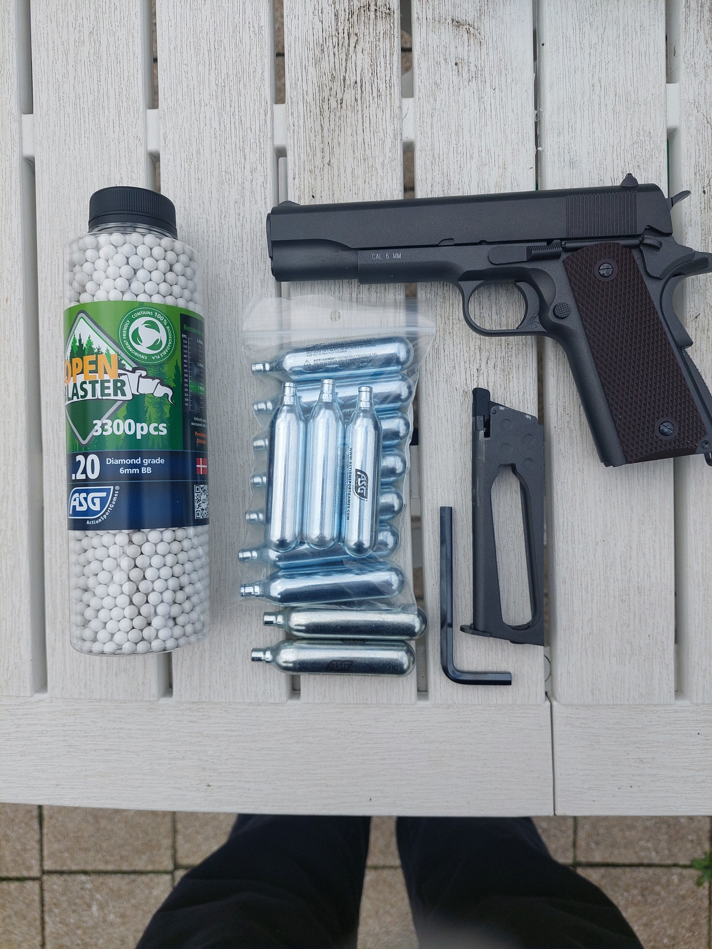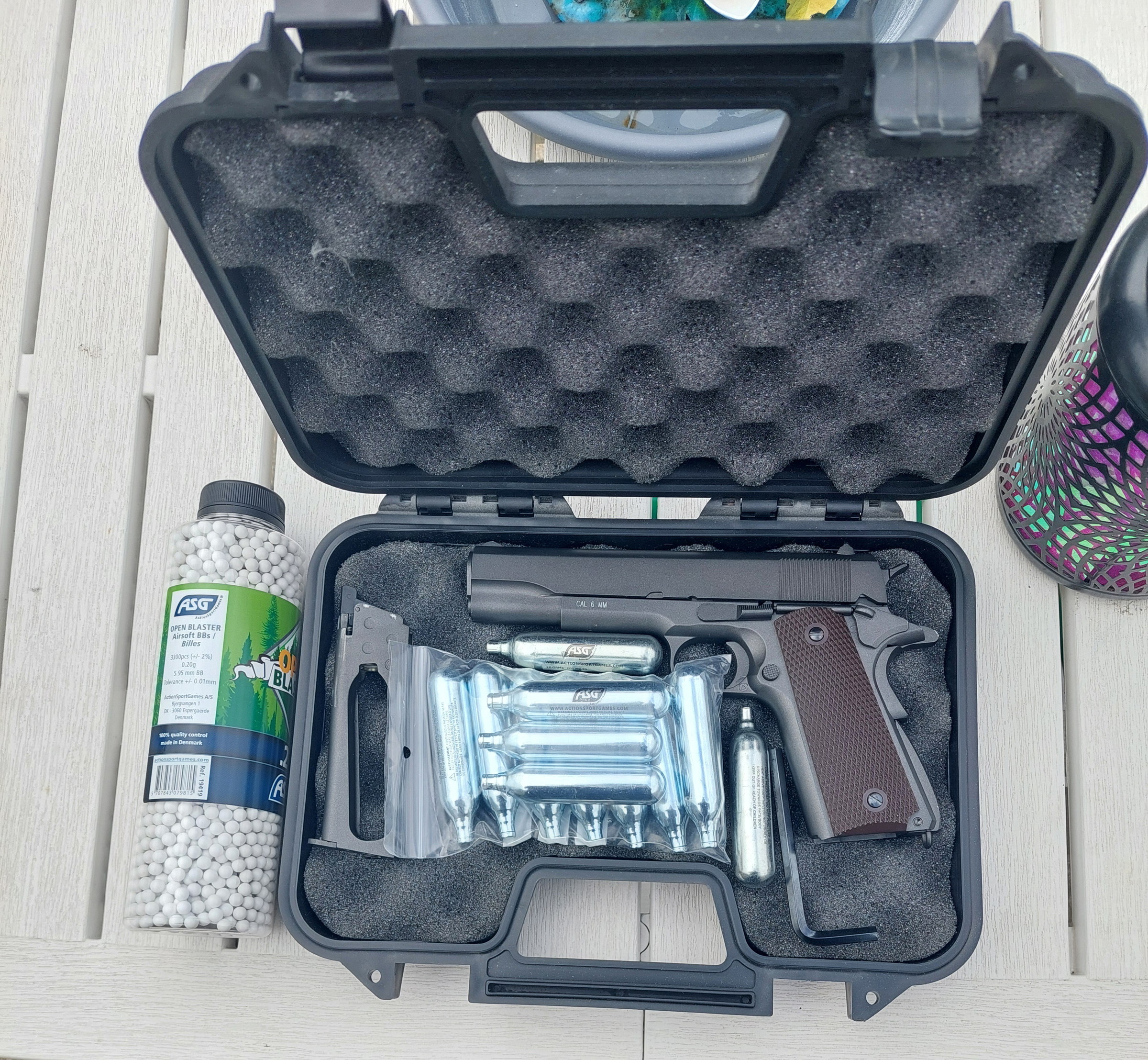 dit wapen is maar een paar maal gebruikt en iedere keer gepoetst en de lader heb ik onlangs nog laten reviseren door dat ik een co2 cartouche inde lader had gelaten en dat was een foutje , als men der een nieuwe instak begon deze zen co2 weg te stuwen dus moest gereviseerd worden voor de rest wapen tip top in orde men krijgt er ook nog co2 patronen bij en ook nog een volle bus OPEN BLASTER Airsoft BBs/billes bij (6mm) licht voor de veiligheid opgeborgen in kluisje daar zeker men kleinkinderen niet aankunnen komen en zoals o foto' krijgt men het koffertje er ook bij , zeg nog eens ZEER goed onderhouden is zoals nieuw is een colt cybergun 1911 replica