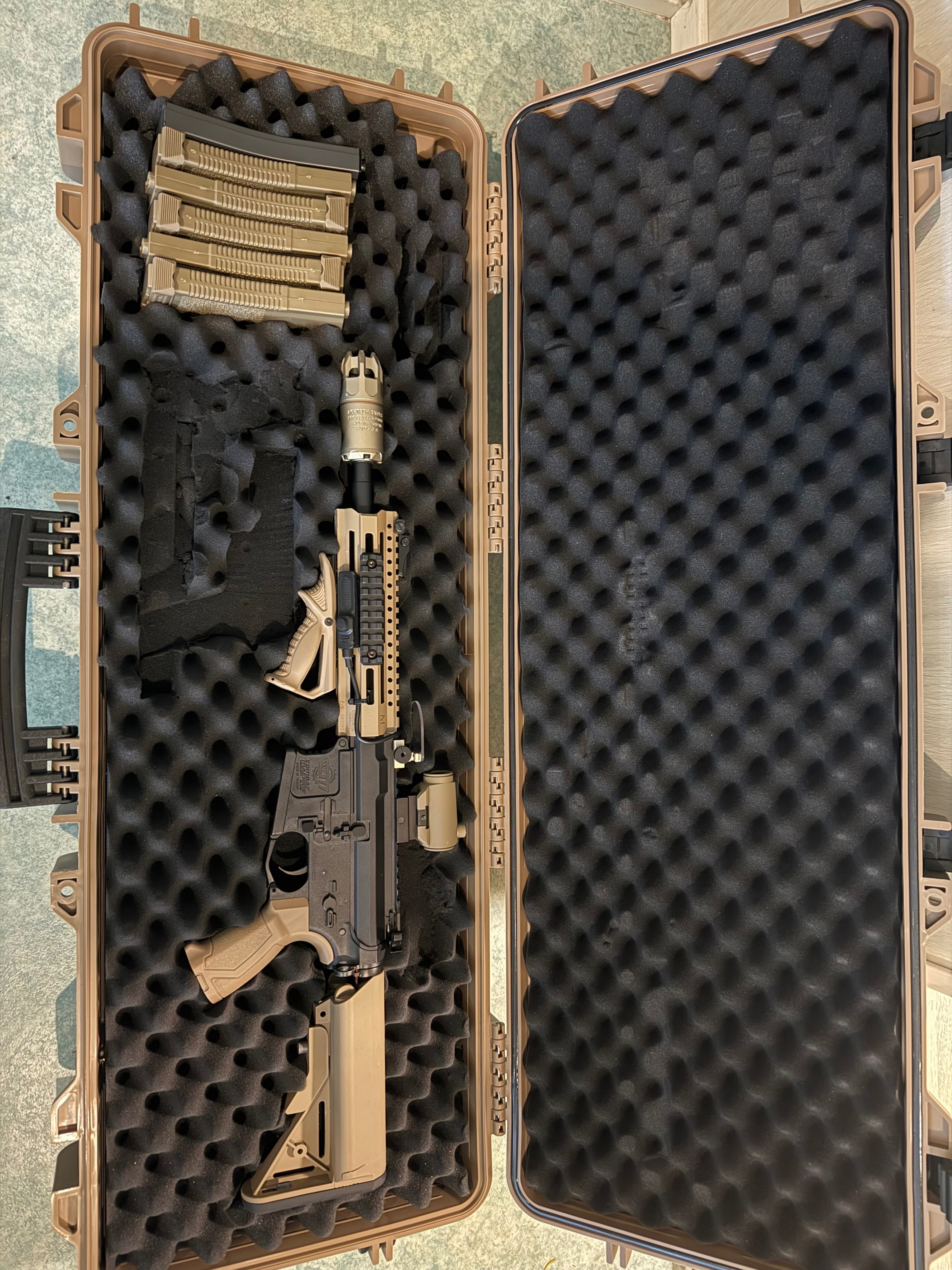 G&G CM16 Raider 2.0, Tan kleur. Inclusief AceTech Tracer, optic, professionele jacht-zaklamp en 6 Hi-Cap magazijnen. Koffer wordt ook mee verkocht