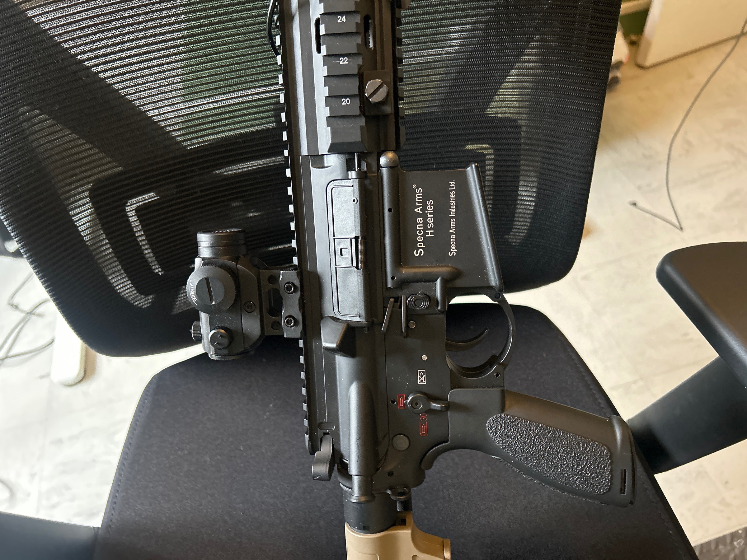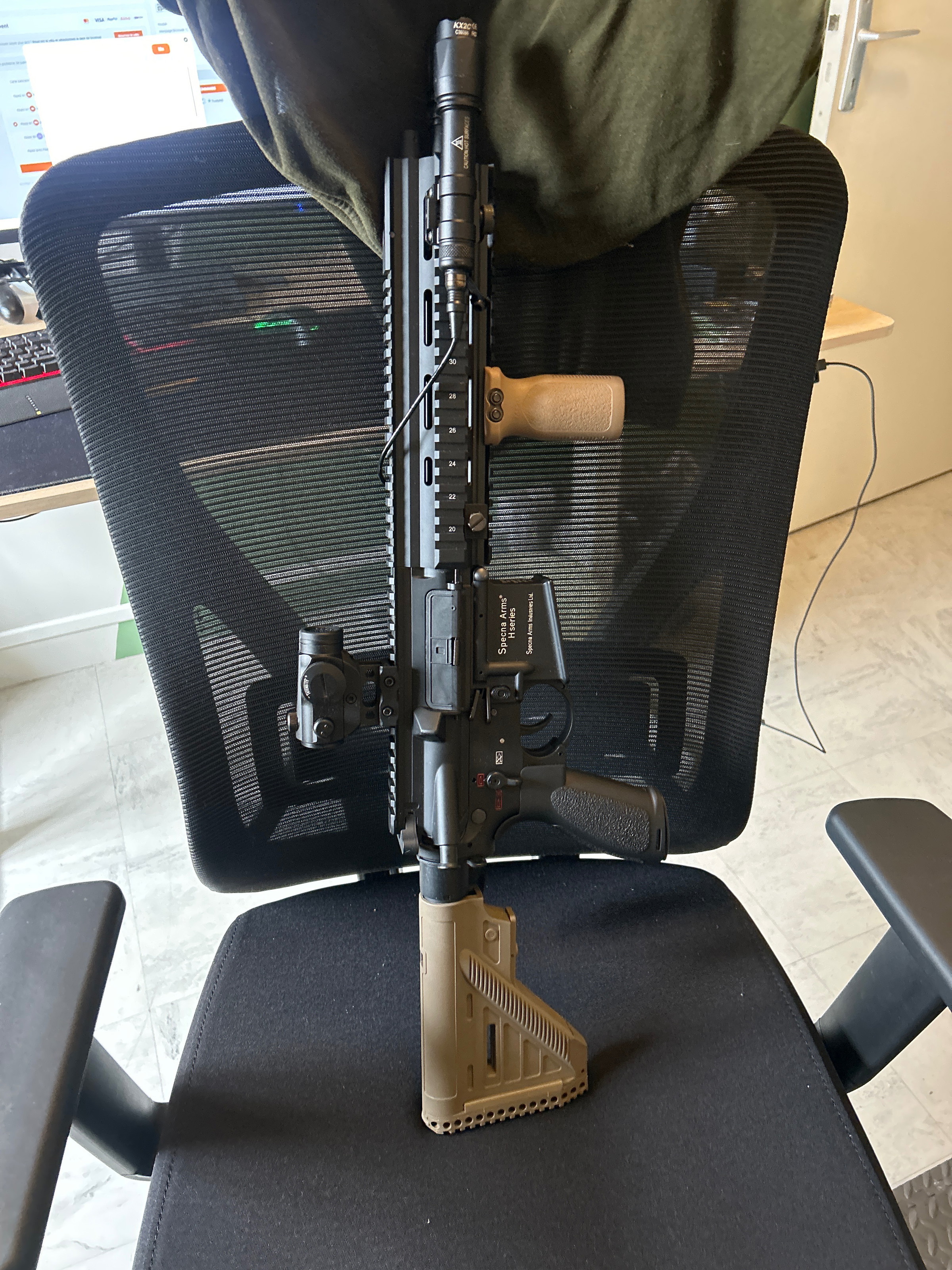 Rajout viseur micro T2, poignée et crosse tan, lampe deportee, 3 chargeurs, billes et gaz avec chargeur batterie.