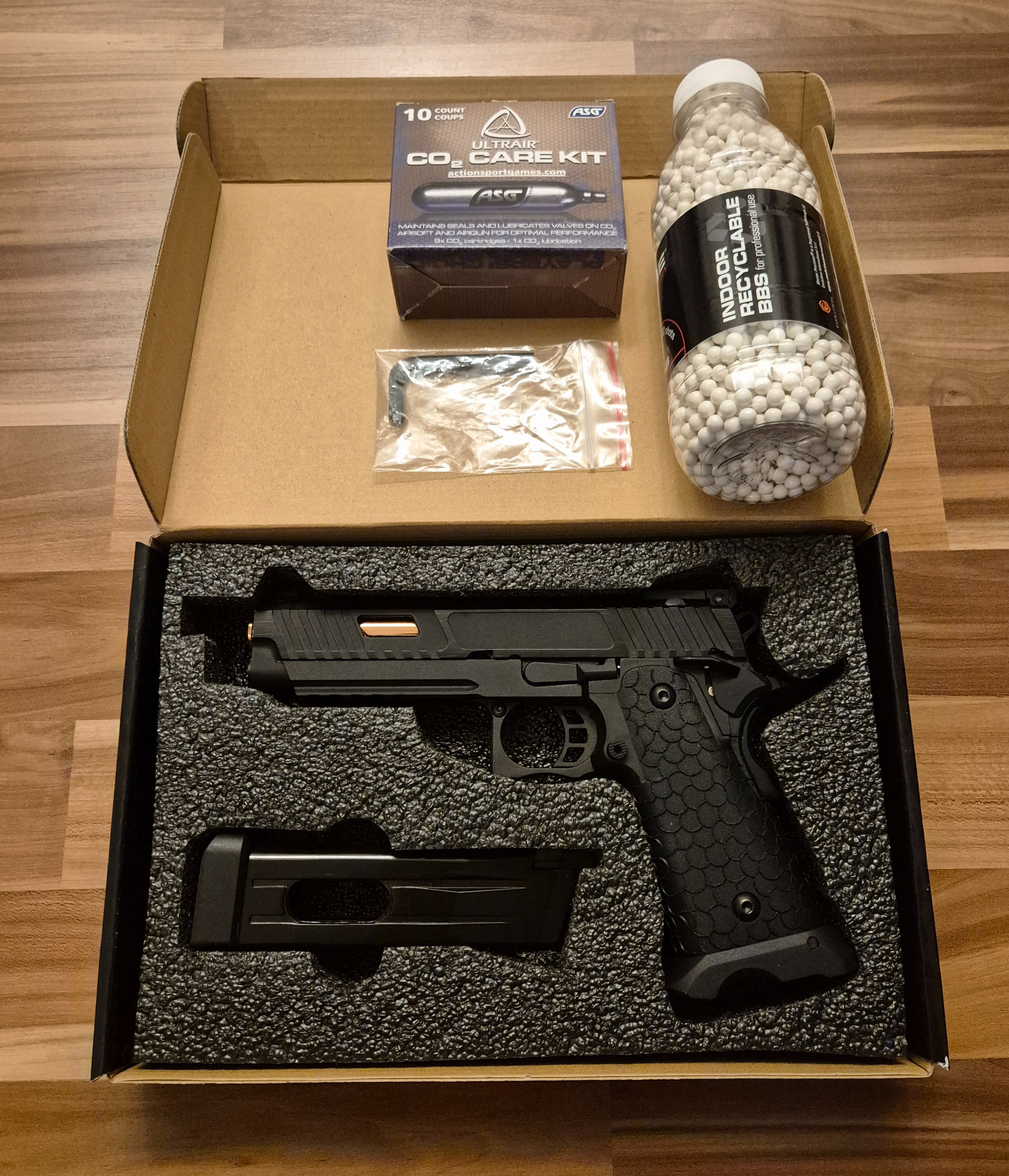 Mit dabei sind außerdem eine neue Packung BB's und ein neues CO2-Care Kit sowie die OVP.