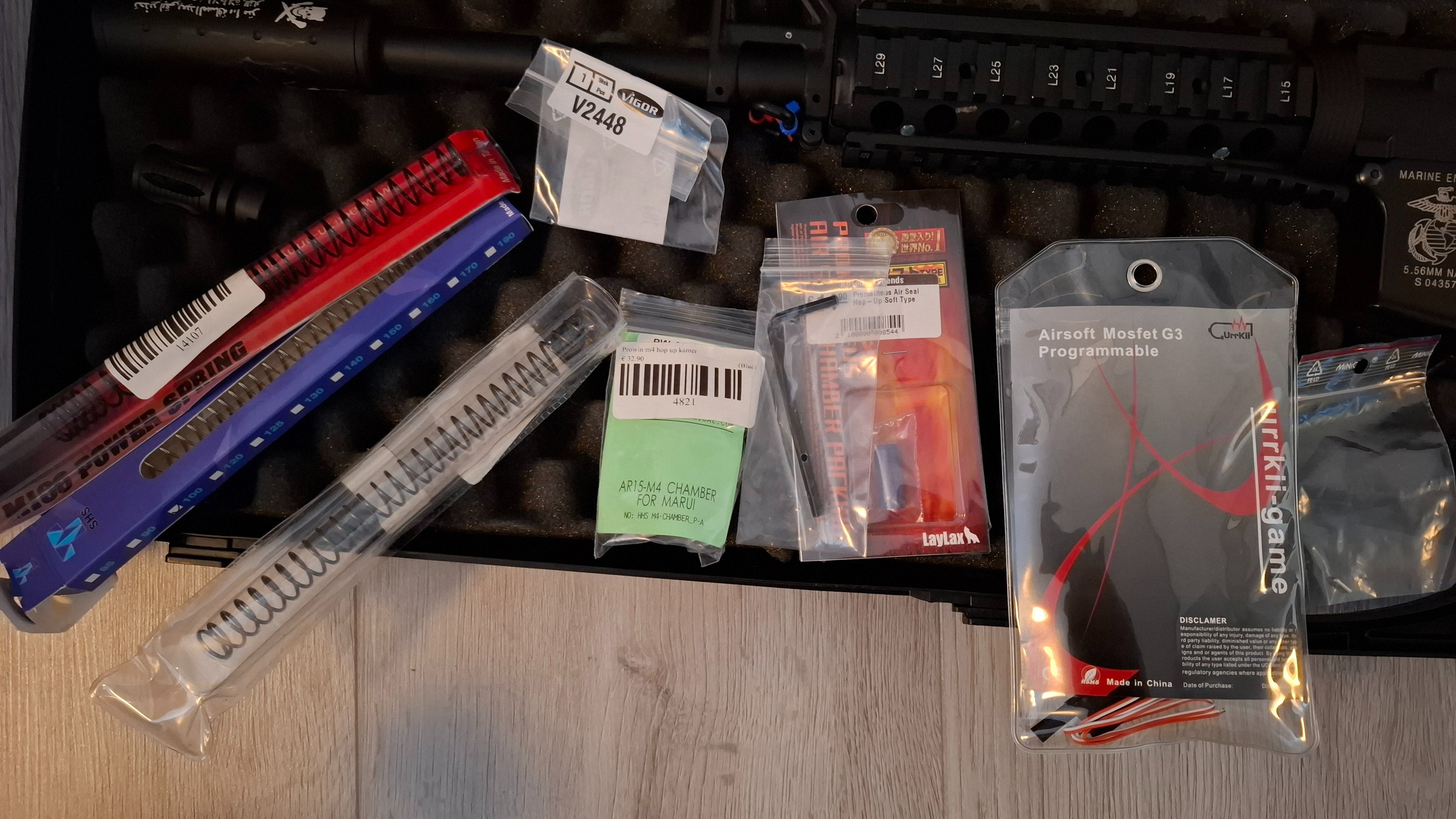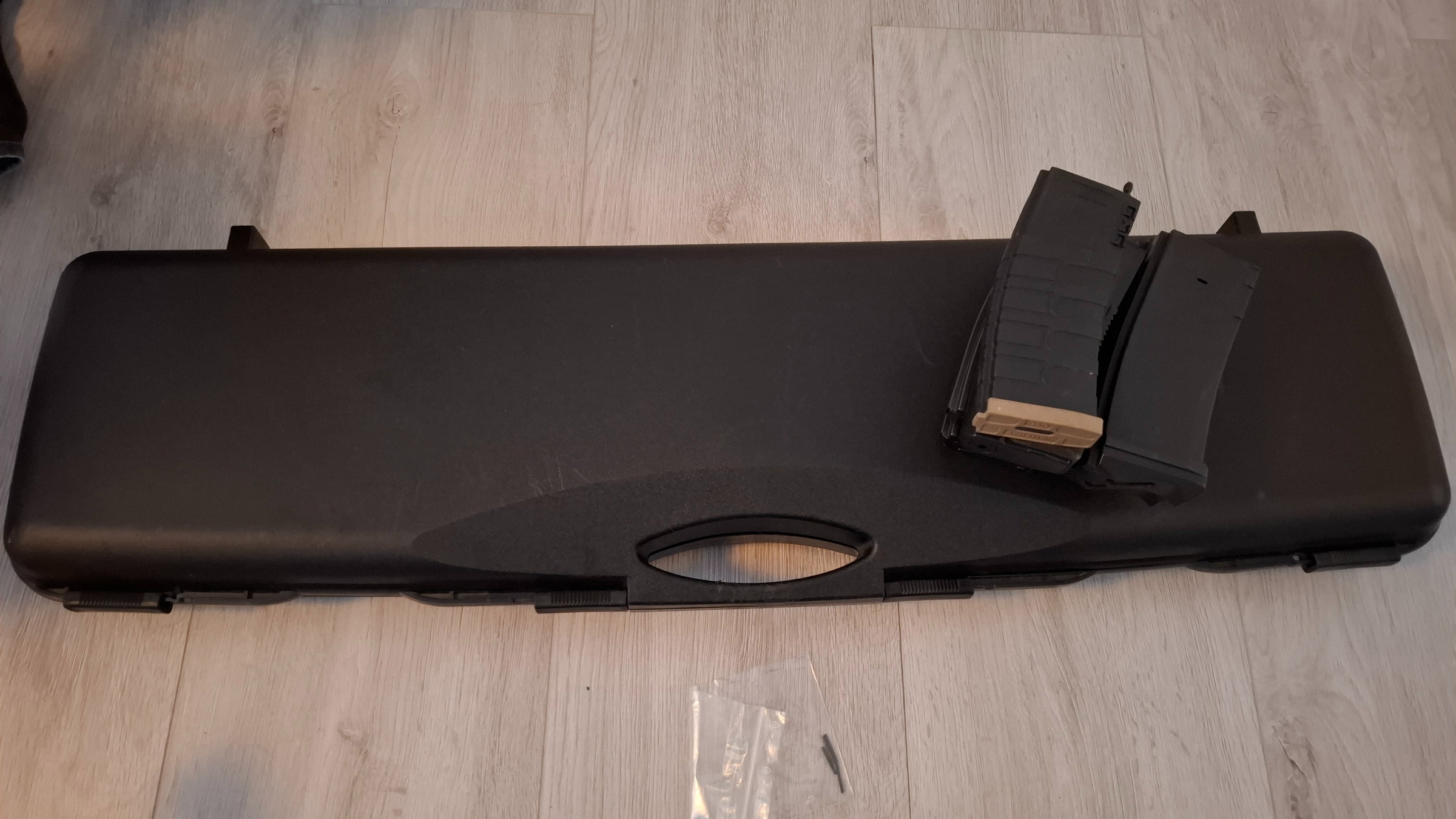 Verkoop met ALLE extra's zoals op de foto's getoond is, zoals bijvoorbeeld de uiterlijke aanpassingen, nog te installeren (zeer goede) mosfet, hard-case wapenkoffer, magazijnen en verschillende soorten veren.