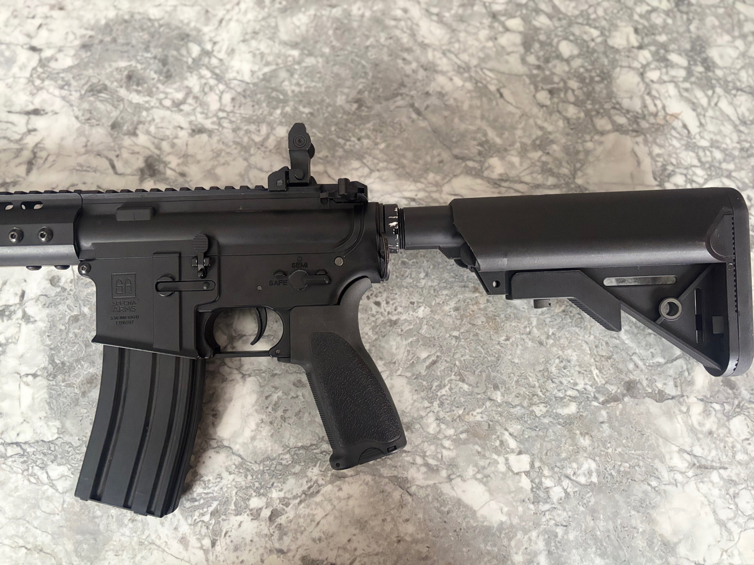 Nette, orginele, Specna Edge met enkel een hop/barrel upgrade. Enige beschading zichtbaar op de stock tube. Replica zelf is volledig van metaal met uitzondering van de pistoolgreep en stock.