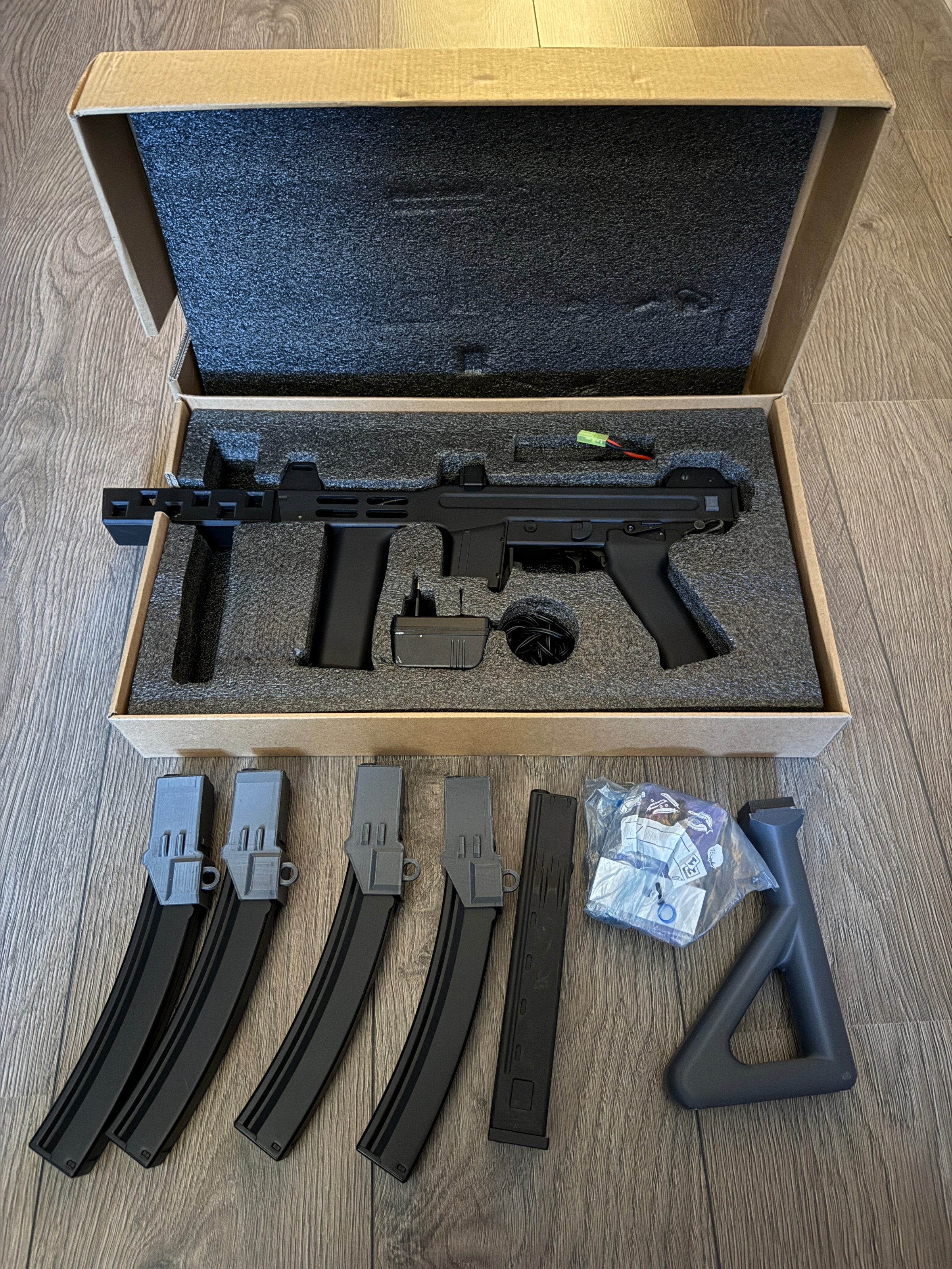 Qua uiterlijk zit er een andere “flash hider” op. De originele flash hider zit er bij waar een supressor op gezet kan worden. Ook is er een stock aanwezig, en 4 mp5 magazijnen die omgebouwd zijn naar de m4 spectre magazijn. Alle originele delen zitten erbij om de loop en bucking na. De originele accu en lader zitten er ook bij.