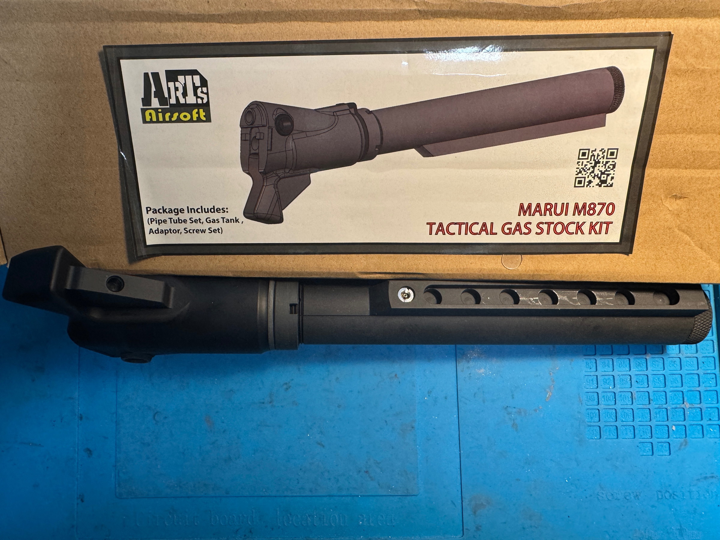 Alpha Parts tactical gas stock kit for the TM M870 tactical shot gun or M870 Breacher is an aluminum kit designed to allow the TM M870 to adapt M4 stocks. The stock also acts as an enlarged gas tank for the shot gun as well.