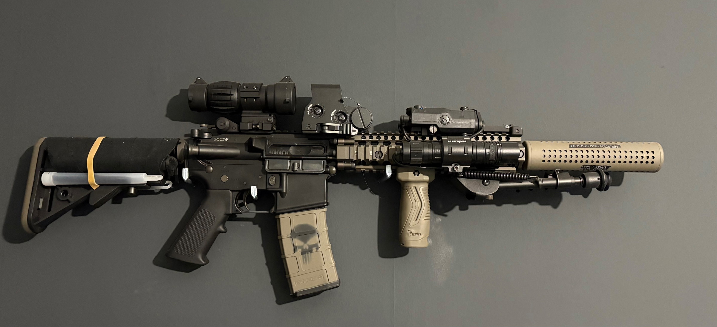 Sie verfügt über diverse Anbauteile und Dekorationen, unter anderem Holo, magnifier, zweibein, frontgriff, zweibein, Schalldämpfer, Lampe und Laser Licht Modul.