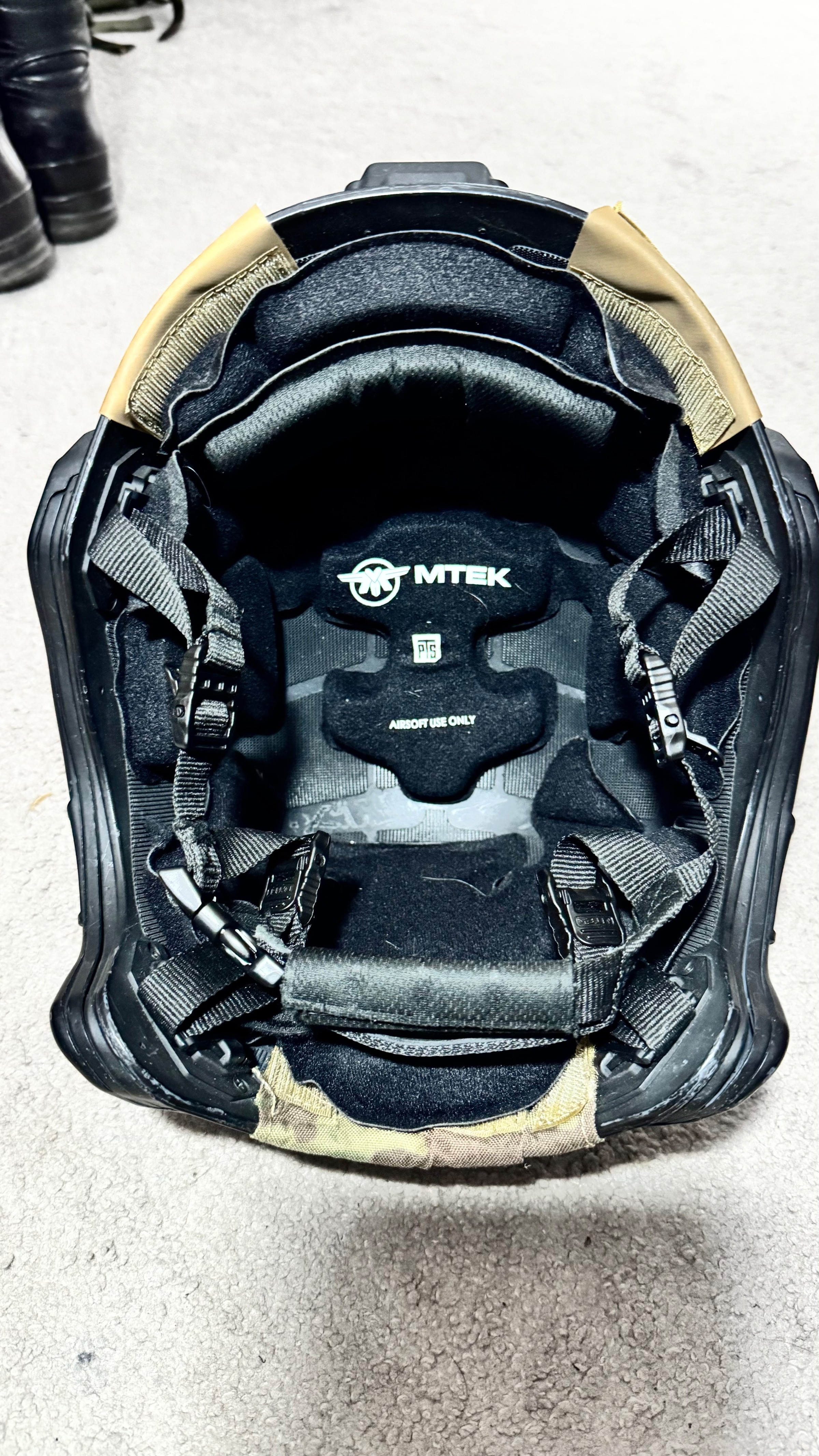 Een zwarte goede helm van het betere merk Mtek flux. Met multicam hoes. Mlok rail systeem