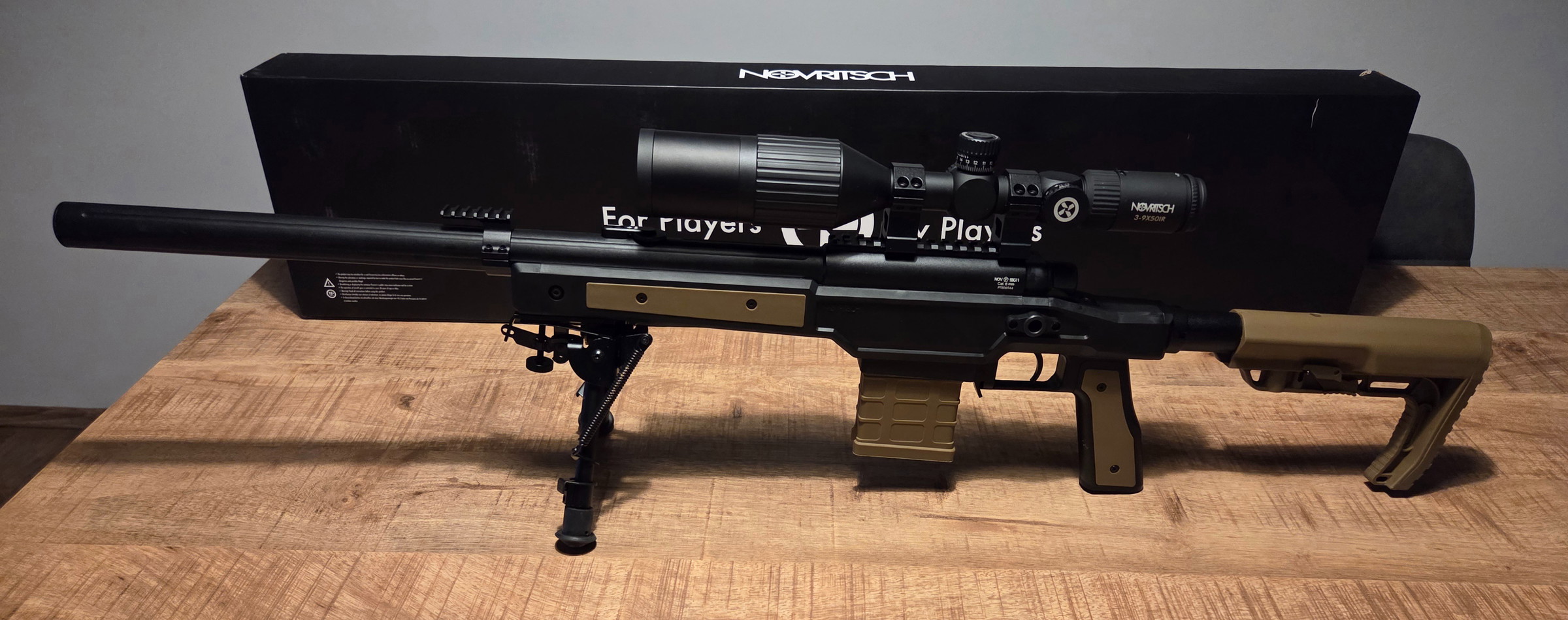 De nieuwe Novritsch SSG11. De sniper is 1x op het veld gebruikt en verkeerd in nieuwstaat. Ook de accessoires zijn allemaal in nieuwstaat en maar 1x gebruikt op het veld. De replica is naast het tan kleuren pakket helemaal origineel en schiet out of the box erg nauwkeurig. De hop-up is makkelijk te verstellen op de barrel. Ook de veer/fps ringen zijn met 10 seconde te vervangen door de uitneembare bolt.