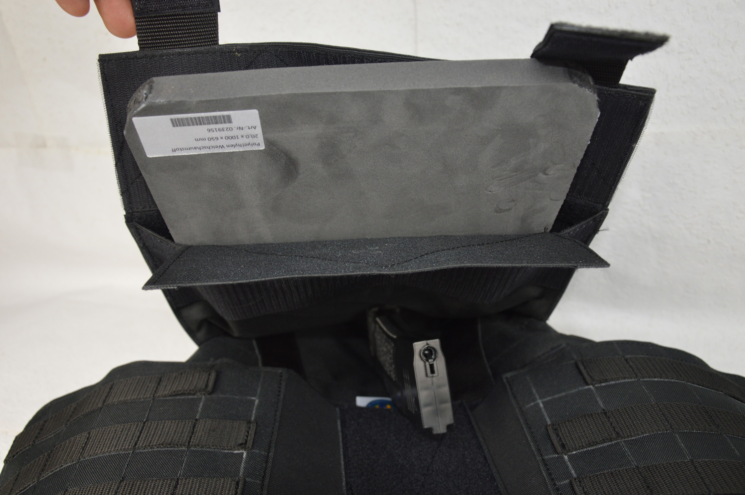 The interior can accommodate soft ballistic and protective panels. 25mm hard foam panels in the SAPI shape and 5mm soft ballistic panels are available as a set.
