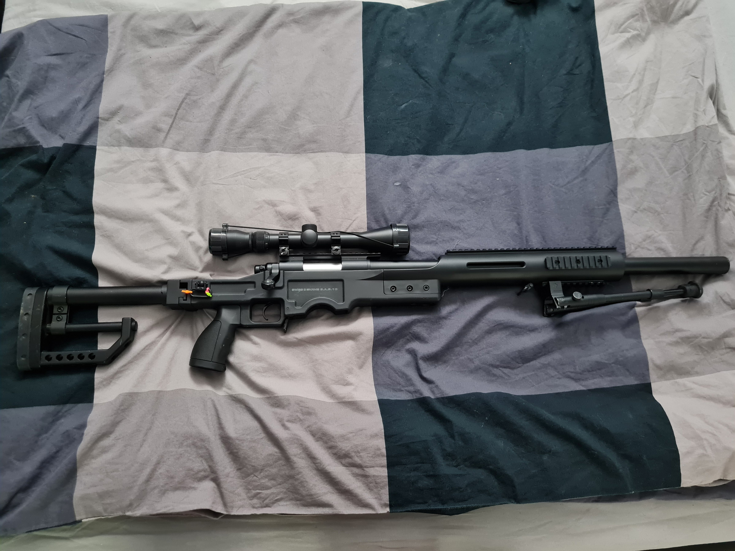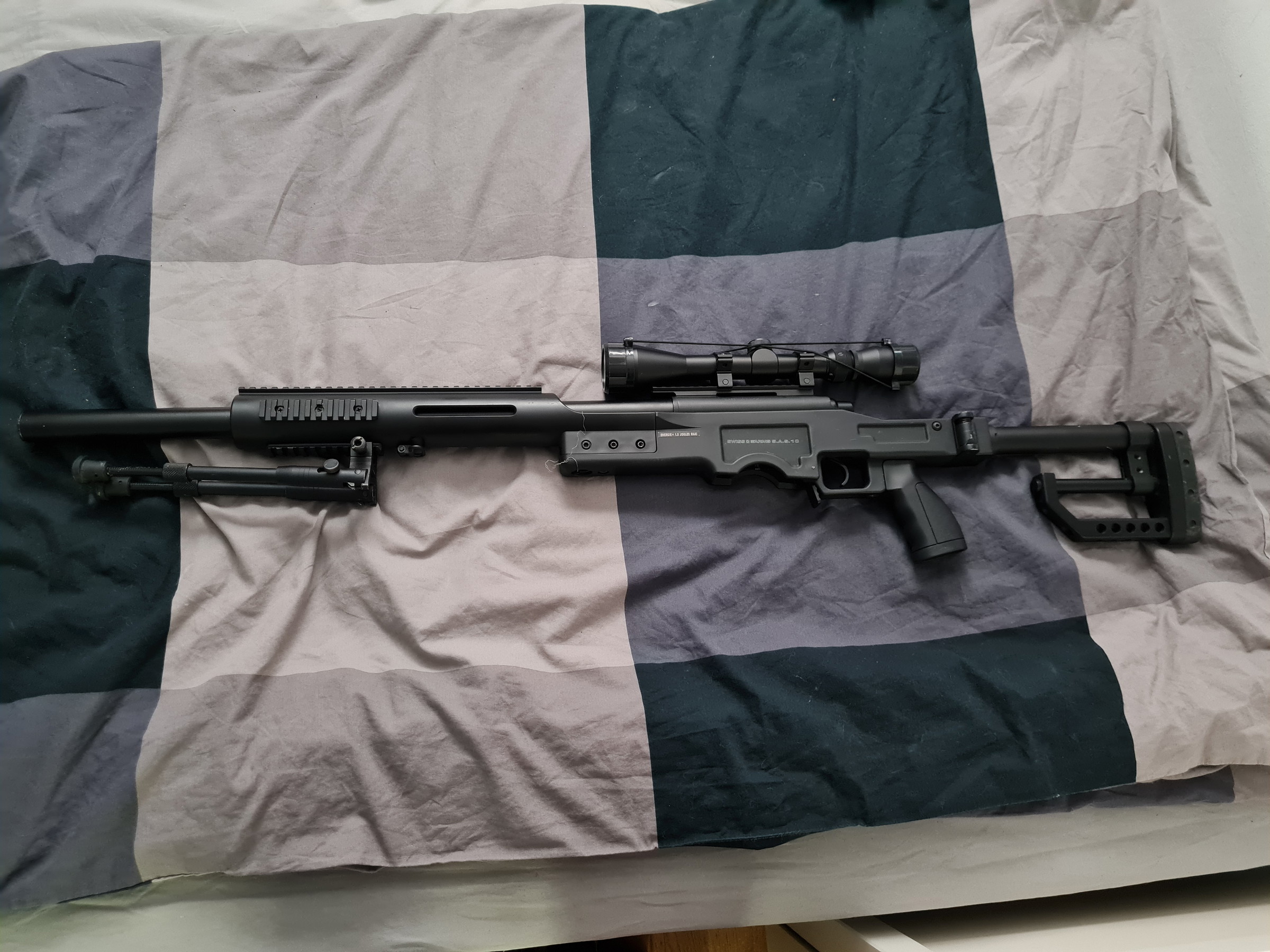 Die SAS 10 von WELL oder auch bekannt von SWISSARMS mit dem Well System basiert auf dem MB05 Sniper System und hatte ursprünglich eine M150 Feder drinnen und wurde zu einer M170 Feder aufgerüstet und schießt statt 1,5 Joule mit 0,36/0,40 jetzt 2,4-2,6 Joule und hat eine Reichweite von 90-100m . Die Waffe wurde nicht so oft verwendet maximal bei 4 Spielen und zog sich danach in die Kammer zurück. Es fehlt allerdings ein Teil (Kugelfänger/BB Guide-Haltering), dass den Kugelfänger am Cylinderlauf befestigt. Es ist irgendwann abgefallen und muss daher neu bestellt werden (Gibt es bei Begadi und vielen mehr) unter MB4405 BB Guide oder im Loading Ramp Set enthalten. Alternativ kann man das auch mit einem O-Ring Gummi befestigen, wenn man geschickt ist. Die Waffe wurde urspünglich um 200 Euro gekauft und mit ca. 50 Euro aufgetunt und mit Visier ausgestattet, daher verkaufe ich sie um 200€. Die Waffe kommt mit Visier und Magazin (40 BBS Kapazität)