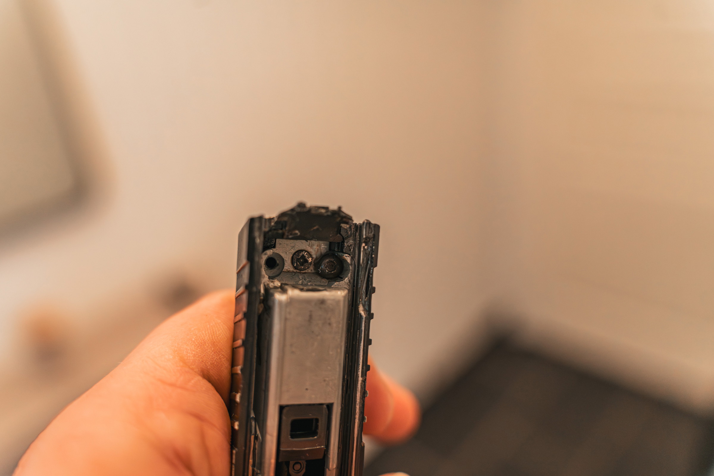 as seen on a pic, the center screw in the slide has been worn in the head. And the one next to it is missing. Works completely fine tho.