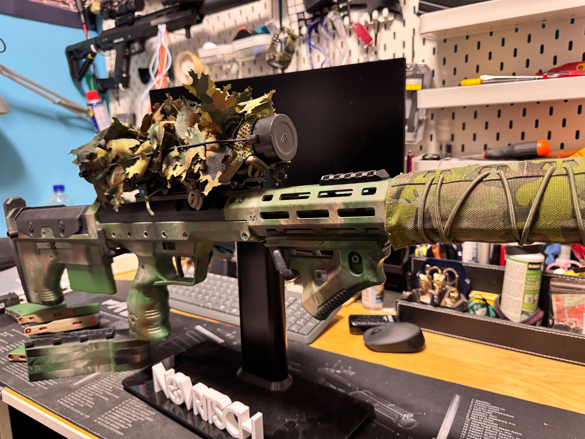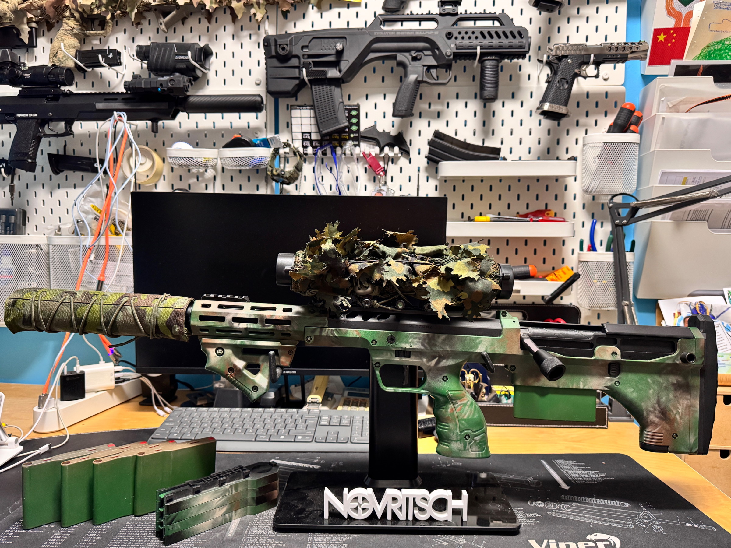 Te koop: Custom SRS A2/M2 Sport — 16" (custom camouflage). Uitstekende staat, goed onderhouden — ideaal voor serieuze airsofters of verzamelaars die direct uit de doos een uiterst precieze setup willen.