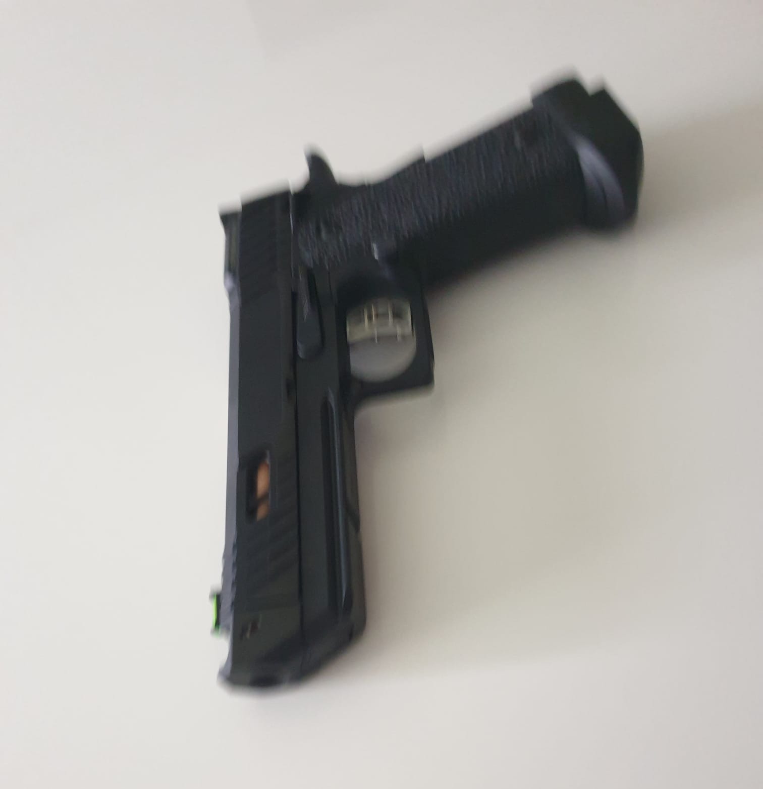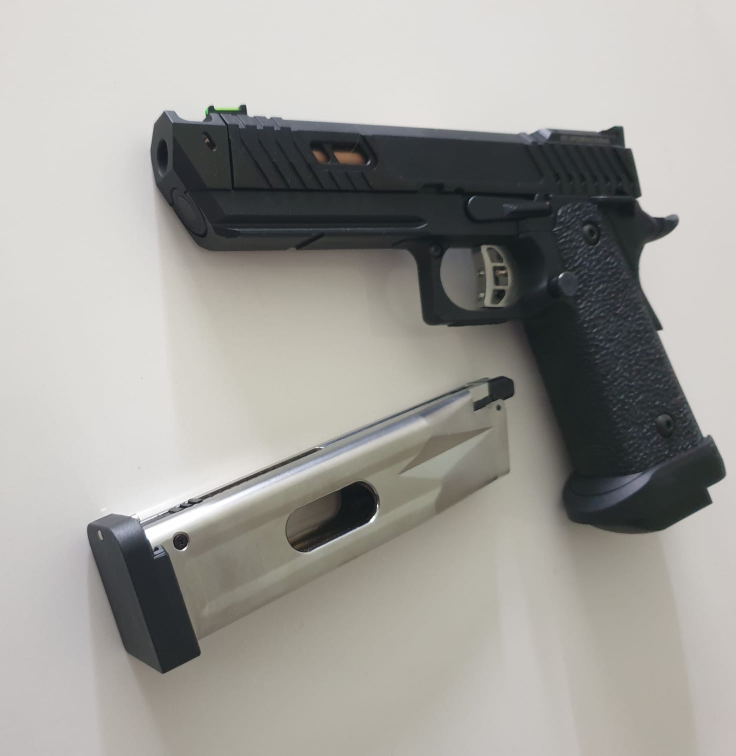 • Deze officiële STI-replica onderscheidt zich door zijn gouden messing accenten op de loop, hamer en compensator. Het ontwerp komt rechtstreeks uit de 2011-serie van STI, bekend van competitieschutters wereldwijd. De skelettrigger, vergrootte bedieningselementen en ingebouwde compensator maken dit niet zomaar een pistool, maar een statement op het veld.