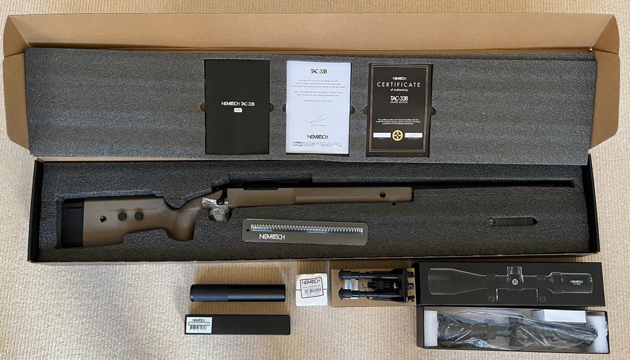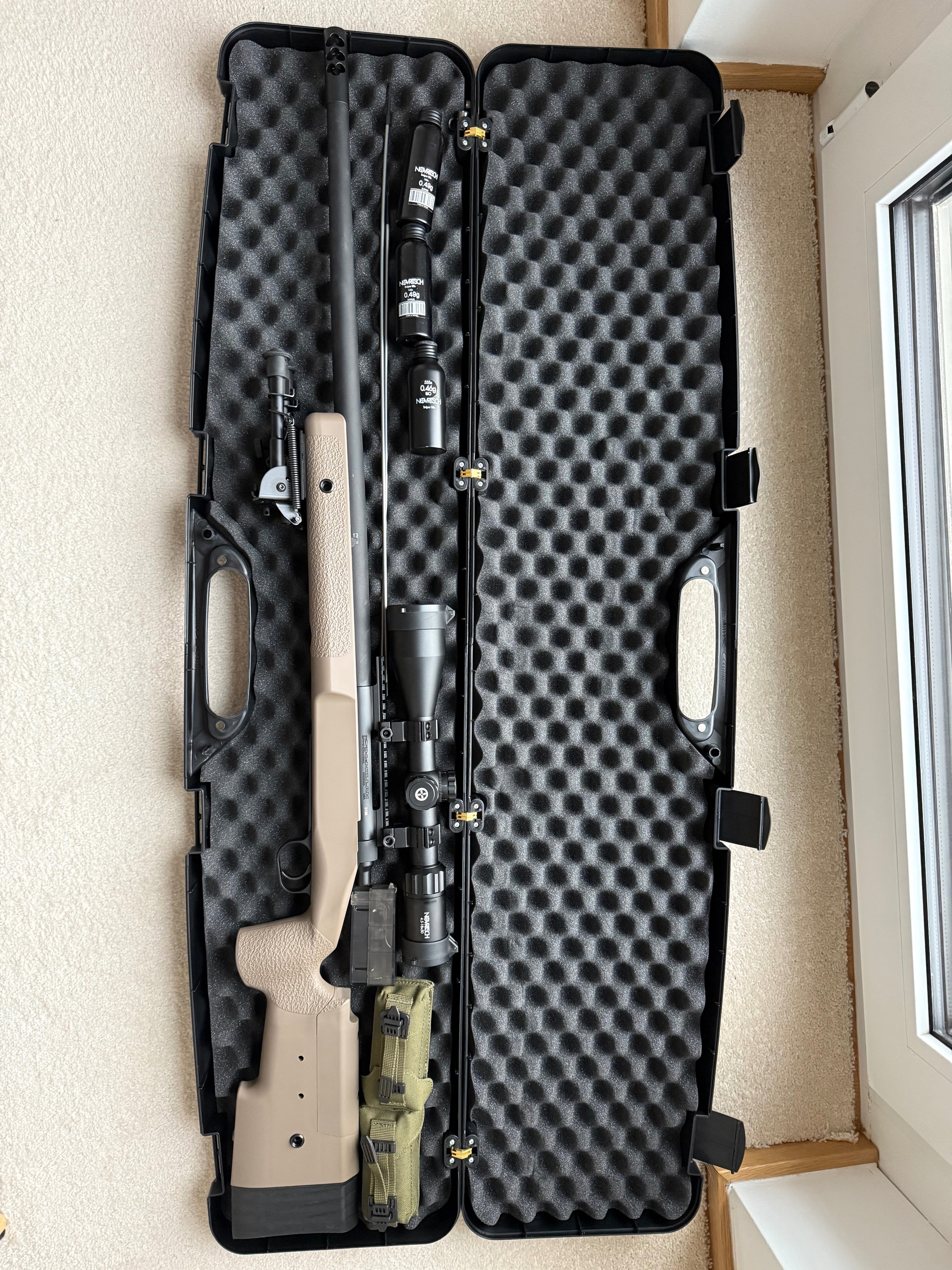 I am selling my precious Novritsch TAC338, which was never used on battle, just some test shoots. So it looks, works and smells like out of the box 😎 I will include all accessories, bipod from Novritsch, Premium scope from Novritsch, 3 original magazins, 2 holsters from Novritsch, 3x 500 BBs from Novrtisch(2x0.49g, 1x0.46g BIO). TAC338 is loaded with M190 spring, which will get you 3.22J with 0.46g BBs. The TAC338 comes in an original box with all the certificates + I will add you this black guncase from Novritsch.