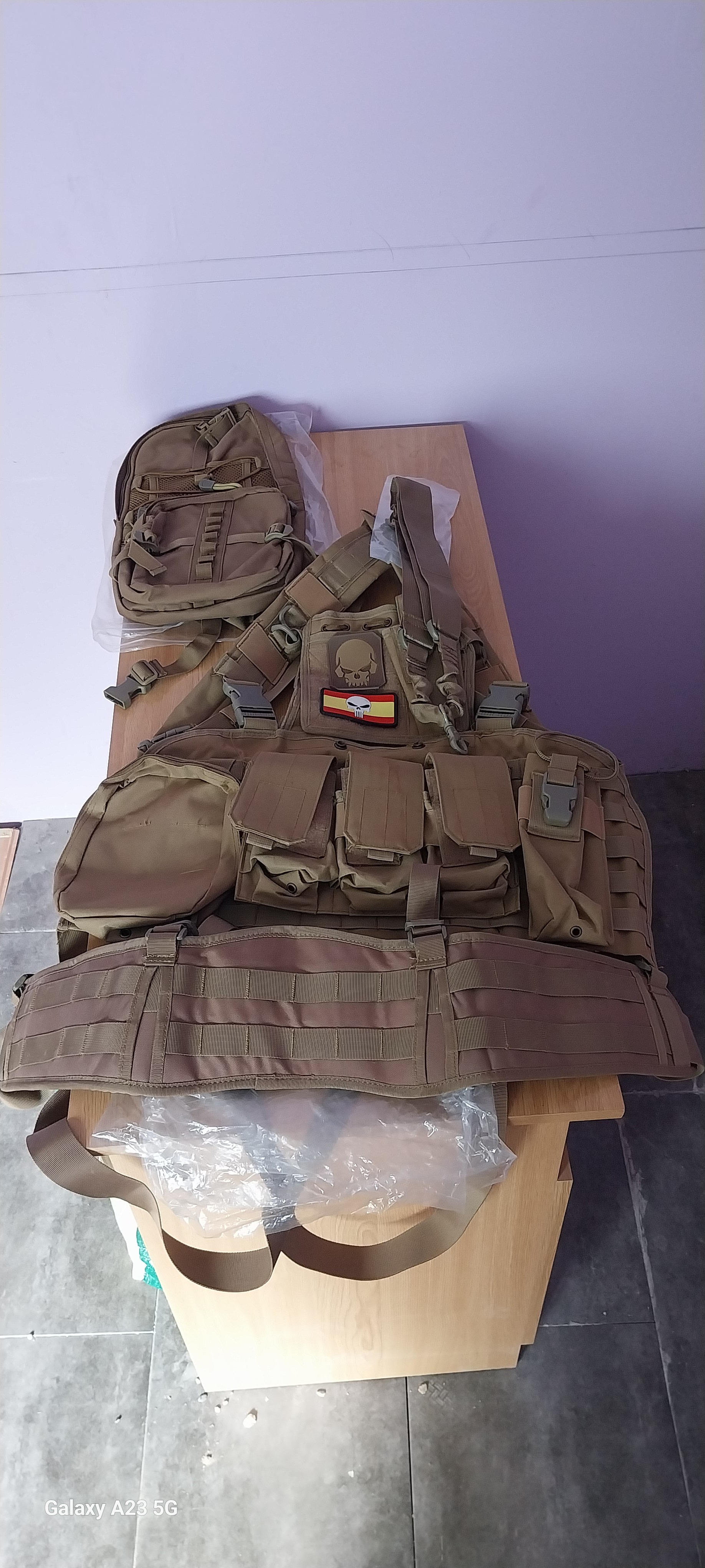 - Chaleco táctico molle completo con múltiples bolsillos, portacargadores, ceñidor independiente ajustable, mochila con camelback y correa tactica para replica.