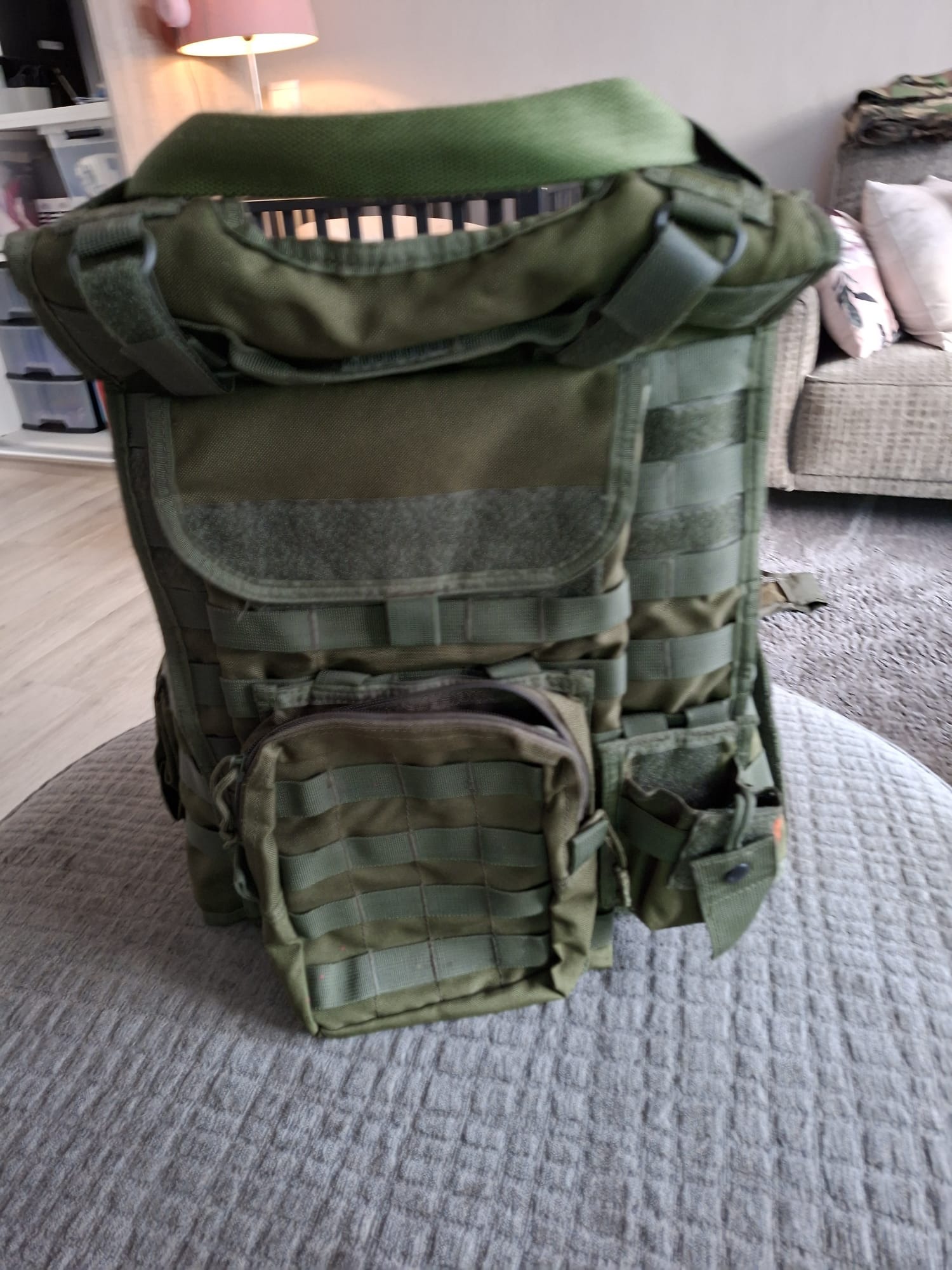 Plate Carrier, Assault belt, helm en bivakmuts met mond bescherming.