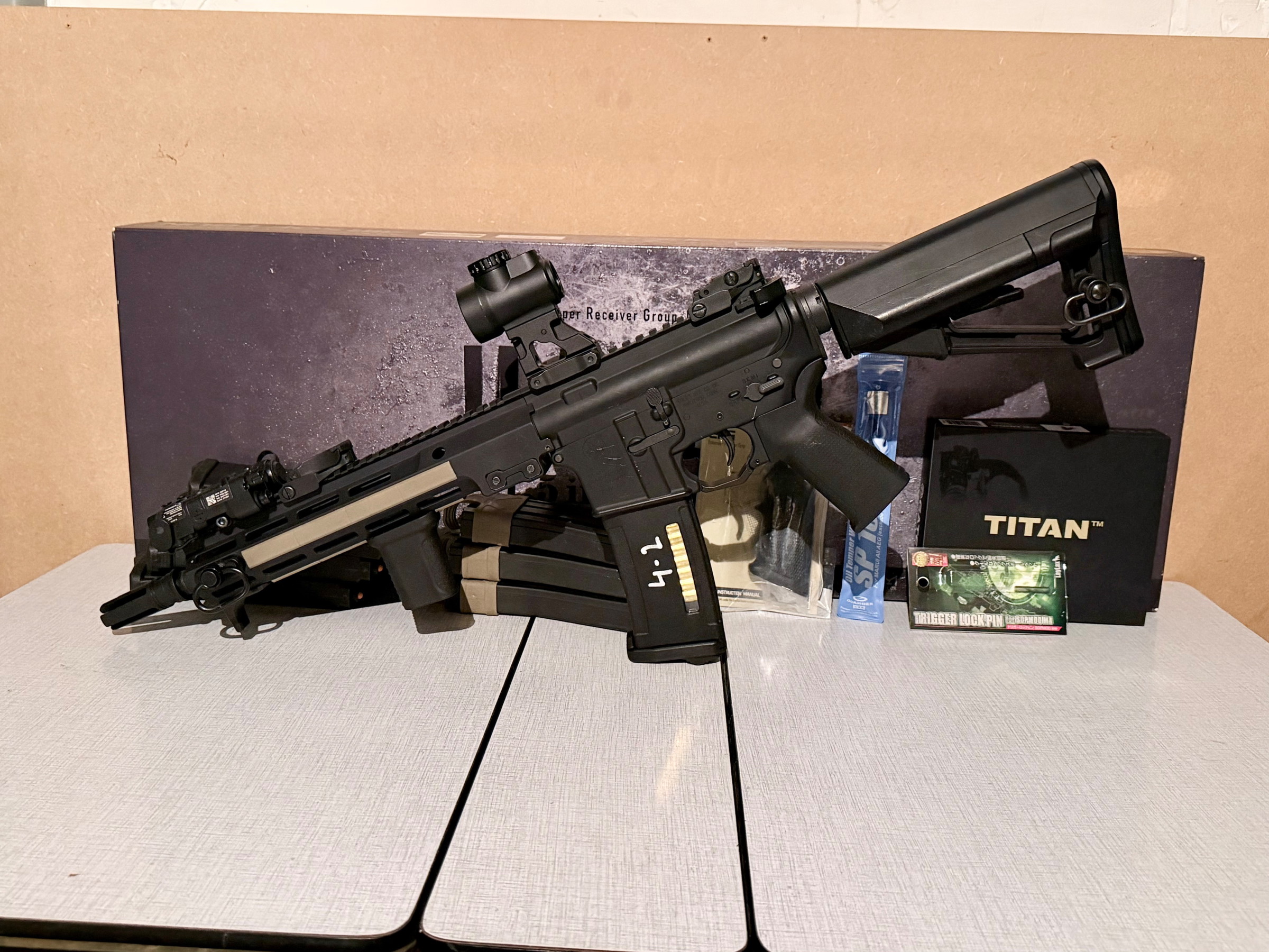 Tokyo Marui URG‑I 11.5" NGRS in uitstekende staat, minder dan 1 jaar oud en geüpgraded. Voorzien van een Gate TITAN Expert MOSFET, perfect afgesteld op 1.1J met 0.25g BB’s. Wordt verkocht als complete skirm‑klare set inclusief 8 magazijnen, optic, accessoires en LiPo’s. Zeer betrouwbaar, netjes onderhouden en technisch in orde.