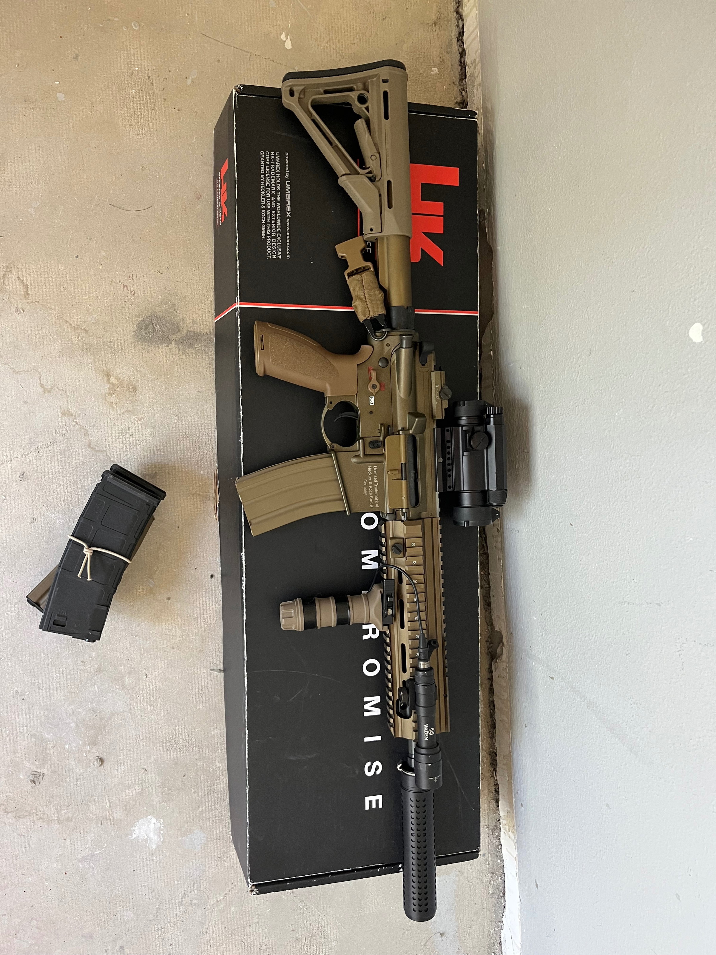 inclusief originele MAGPUL stock, Theta optics scope, silencer, flashlight en diverse magazijnen.